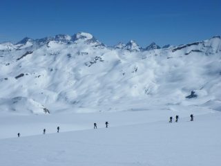 Si incontrano un po’ tutti i tipi di neve. Nella parte alta crosta da vento morbida sopportabile con rari placconi di ventata infarinati, scendendo sul ghiacciaio farina da urlo e scendendo ancora farina ma con vecchie tracce seminascoste. Continuando a scendere verso il Rif.Benevolo di nuovo farina nei pendii in ombra mentre al sole tratti in via di trasformazione (ma senza crosta) e tratti di trasformata dura ma con superficie eccessivamente ruvida. Dal rifugio tracce odiose e crosta . Sotto ancora farina con tracce fino al ruscello poi finalmente primaverile e firm compresa la strada che da thumel porta a Rhemes. I pendii a sud presentano le solite numerose scariche ma occhio che a nord è tutto appeso.