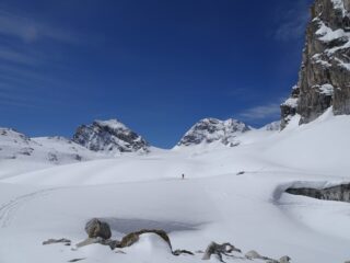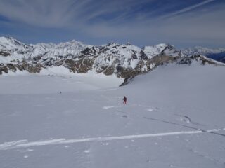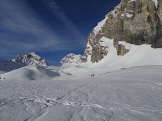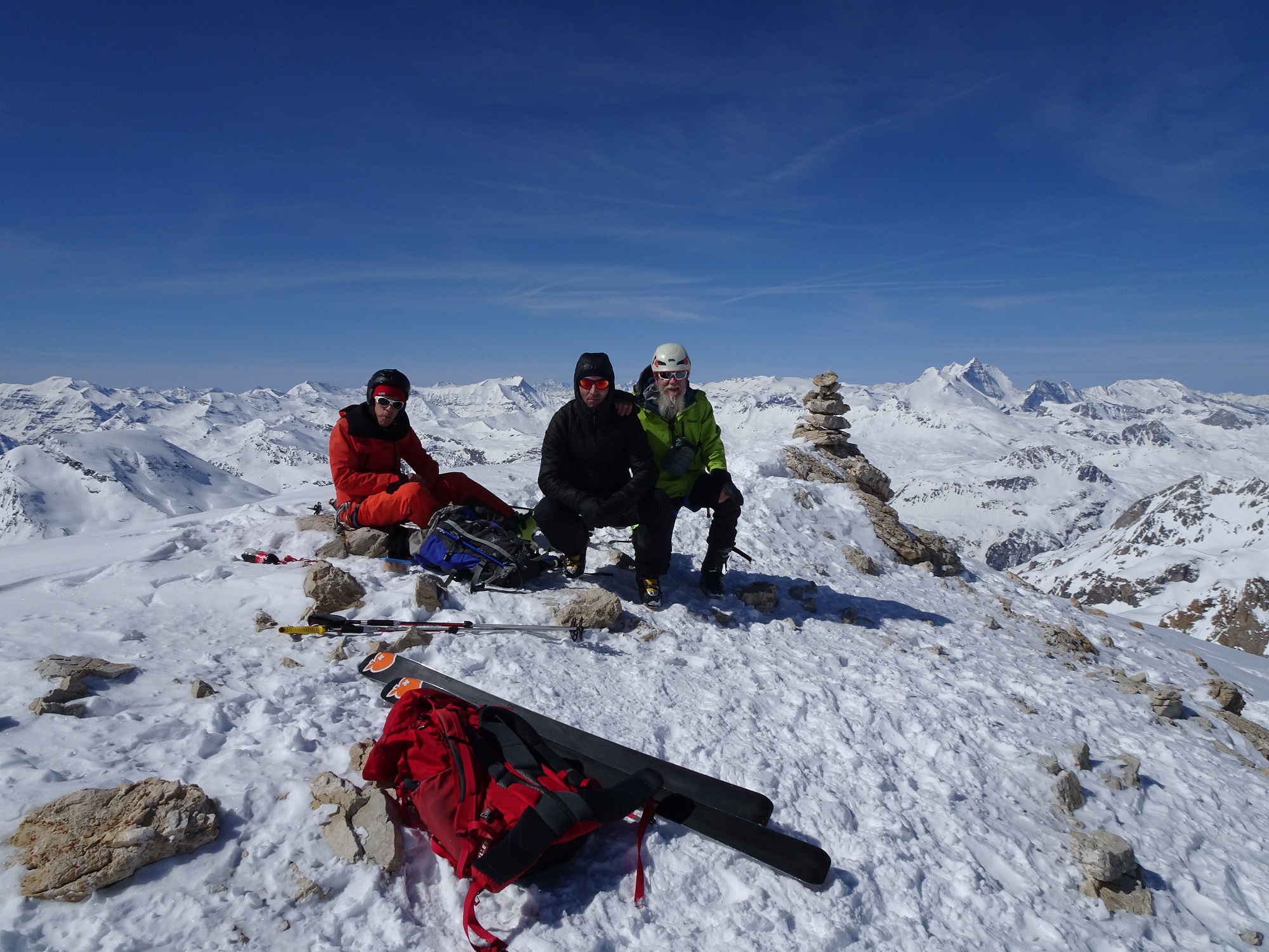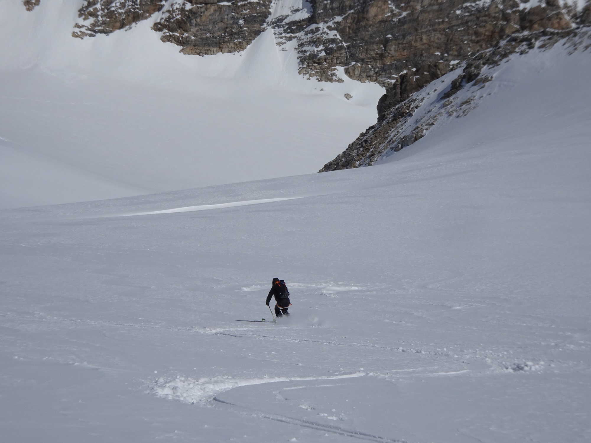 Condizioni ottime in zona. La neve caduta i giorni precedenti ci ha regalato una discesa su neve fresca in alto e primaverile in basso. Freddo e tanta neve per la strana stagione in valle. Saliti con i coltelli indispensabili per il lungo traverso iniziale. Giornata fredda con cielo blu cobalto. Arrivati in vetta alle 10:15 ci siamo goduti il grandioso panorama, si stava proprio bene. Prima parte di discesa su neve fresca poi un tratto in via di trasformazione poi finalmente primaverile fino al Rifugio. In discesa siamo scesi a sinistra seguendo delle tracce, ma arrivati quasi alla fine ci siamo trovati un canale molto ripido (40°) molto lisciato dai passaggi e con un salto di roccia in fondo. Massimiliano lo ha sceso con gli sci, io e Nino per prudenza con i ramponi. Dal Rifugio si scende bene fino al primo ponte. Alcuni scendevano ancora con gli sci sul lato destro, noi abbiamo preferito seguire il sentiero estivo a piedi salito anche all’andata. Gran bella sciata. In compagnia di Nino e Massimiliano. Rifugio bello pieno ma con soli 4 italiani.