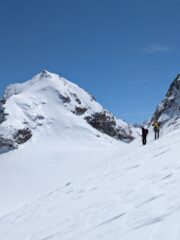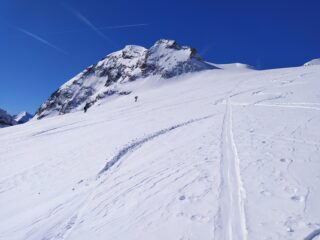 Partiti dal rifugio Benevolo h 7.00. Abbiamo risalito il pendio piuttosto ripido con i coltelli che porta verso la Granta (trace visibili dal rifugio). Da lí inizia un lungo traversone sotto le imponenti pareti rocciose. Salita alla Calabre di ripiego, volevamo fare la Tsantelleina ma non era in condizioni (poca neve, colletto impraticabile con gli sci). Ci abbiamo impiegato circa 4h a salire. Poche tracce di discesa per cui primi 250 m di grande soddisfazione con neve polverosa. In discesa consigliato seguire la traccia di salita in traverso. Noi abbiamo provato a deviare a dx della traccia attraversando la parte piatta del ghiacciaio di Tsantelleina ma dall’altra parte ci sono solo salti di roccia per cui ravanata epica per ritornare in traccia. Neve nella parte bassa ormai marcia.
