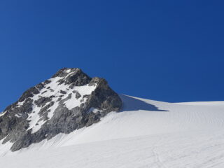 Ci siamo ramponati e legati e abbiamo iniziato il lungo affiancamento alla parete della Granta Parei, per poi salire i vari dossi del ghiacciaio senza difficoltà fino in vetta. Rigelo discreto fino a 3100 metri, poi finalmente neve ben portante. I crepacci nella zona a cavallo dei 3050 metri sono ben visibili ed evitabili.