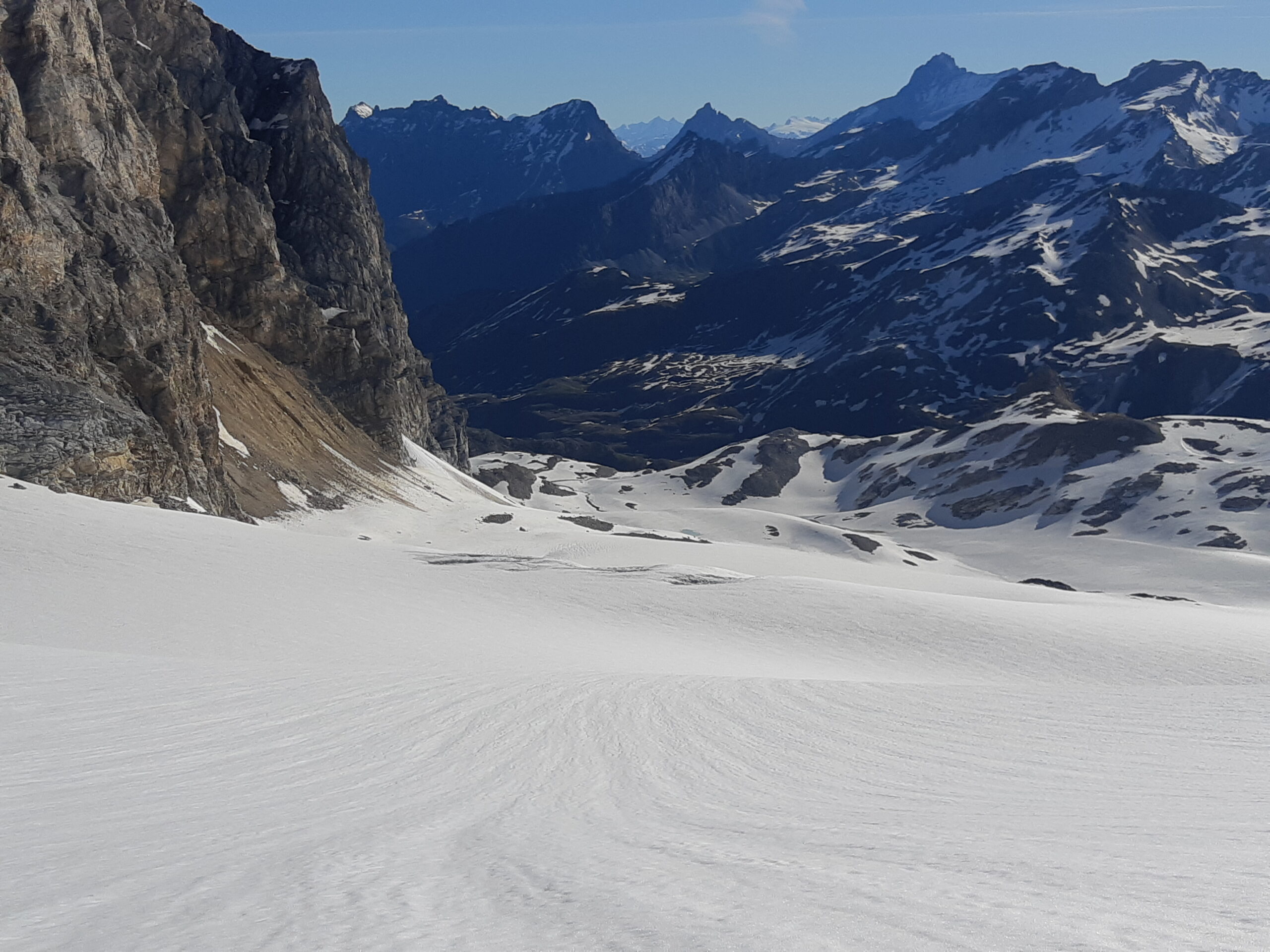 Gita in ottime condizioni, attualmente in configurazione di passaggio tra primavera ed estate, il che permette di calpestare più neve ed evitare lunghe morene. Ma andiamo con ordine: dopo aver pernottato al rif. Benevolo (primo giorno di apertura estiva, ottimo trattamento), siamo partiti alle 5.10 e abbiamo effettuato il periplo del Truc di Sant’Elena (il percorso degli skialp) per evitare il canale ripido ancora innevato. Abbiamo quindi puntato in direzione Granta Parei, trovando la neve continua a partire dai 2640 metri (fino a lì alcuni nevai, in gran parte evitabili).