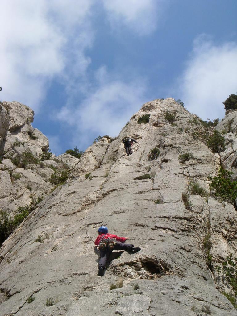 - L2: 6a+( più duro del precedente): splendida fessura, purtroppo unta per poi proseguire verticalmente fino ad un terrazzino, seconda sosta su spit. tiro protetto un po’ lungo su spit…meglio integrare.