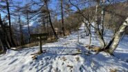 Attraversare tutto il paese e al primo bivio significativo prendere a sx (indicazioni pian Bracon). Quando, dopo circa 15 minuti, si esce dal bosco e si vede una fitta macchia di conifere, salire a raggiungerla (in questa zona il sentiero e’ molto labile) fino ad arrivare ad un colletto al di la’ del quale si incontra il sentiero Frassati che arriva da Traves.