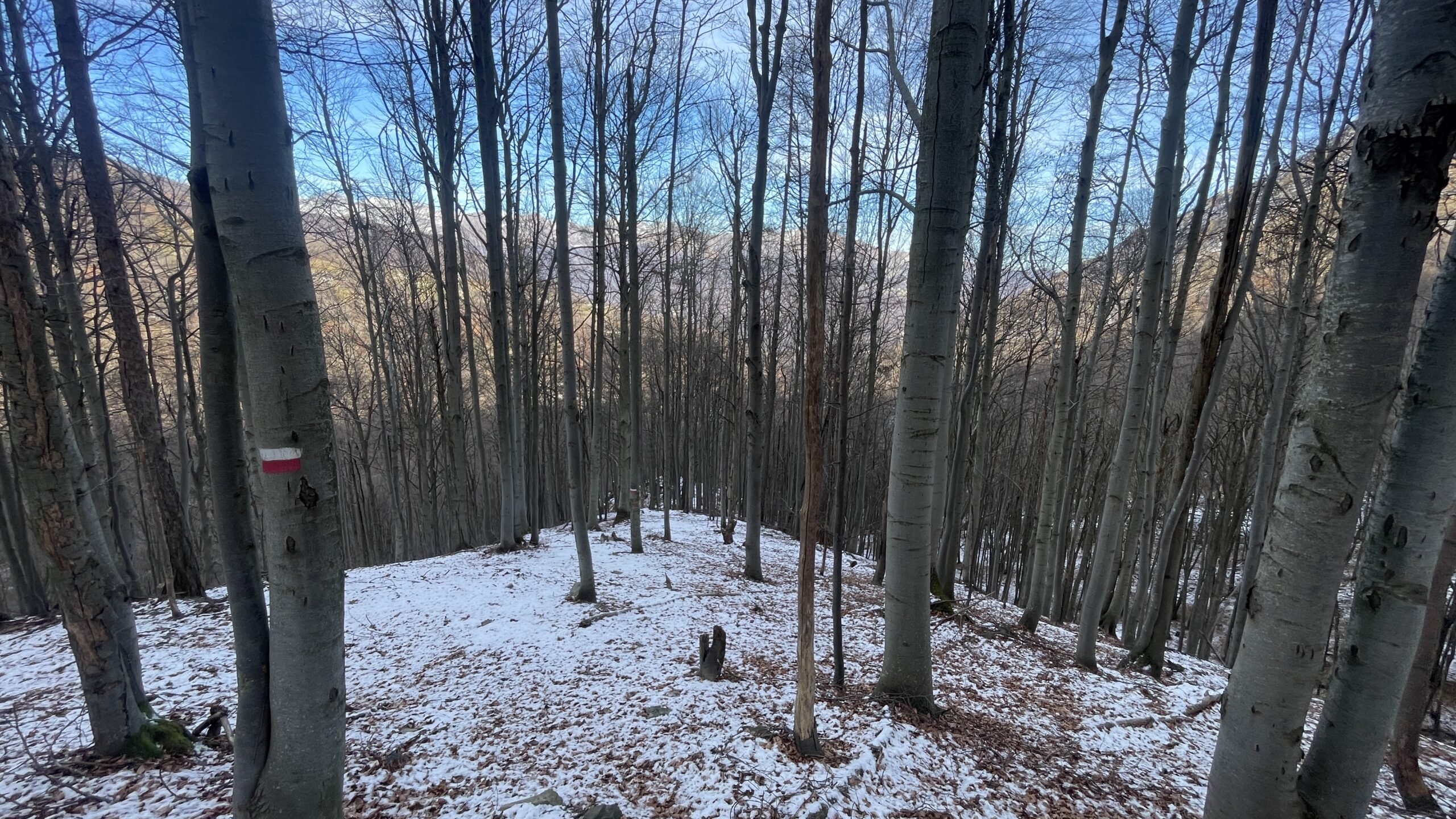 Scendere per la strada asfaltata per circa 500 m e prendere a sx su prati (segni bianco-rossi) fino a raggiungere una grande casa e di qui tenendosi alla sua sx in discesa nel bosco (in questo tratto la traccia e’poco visibile).