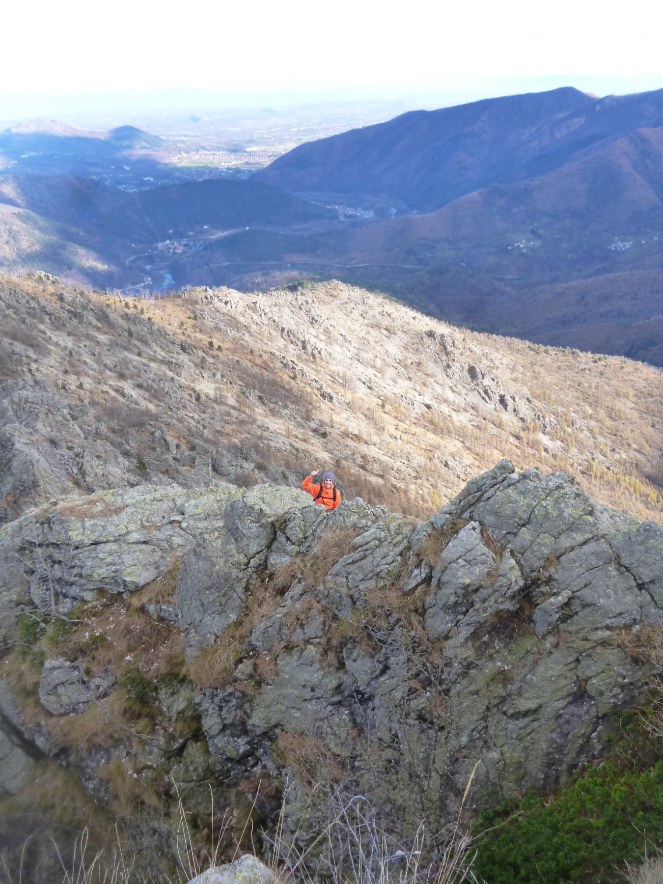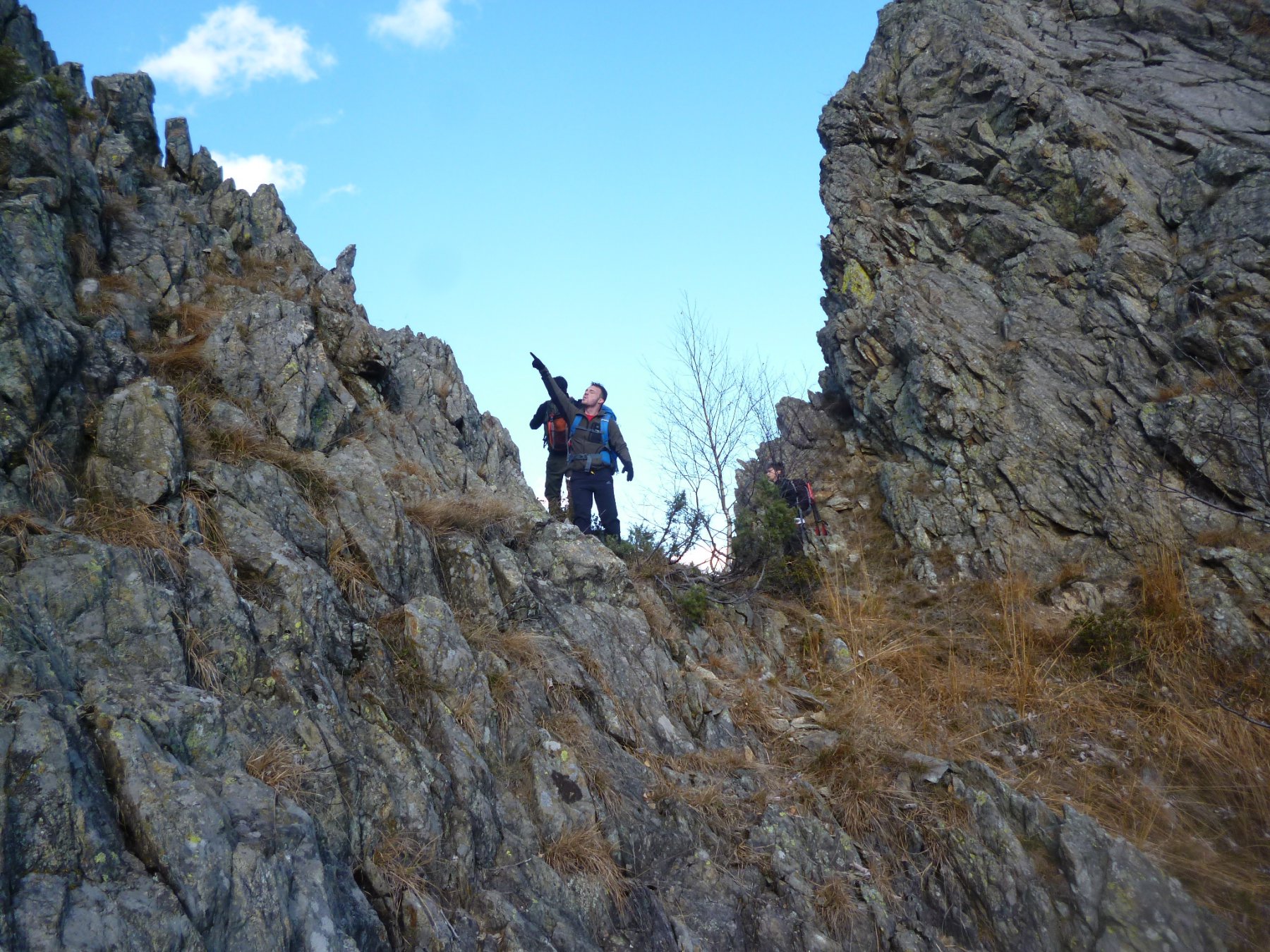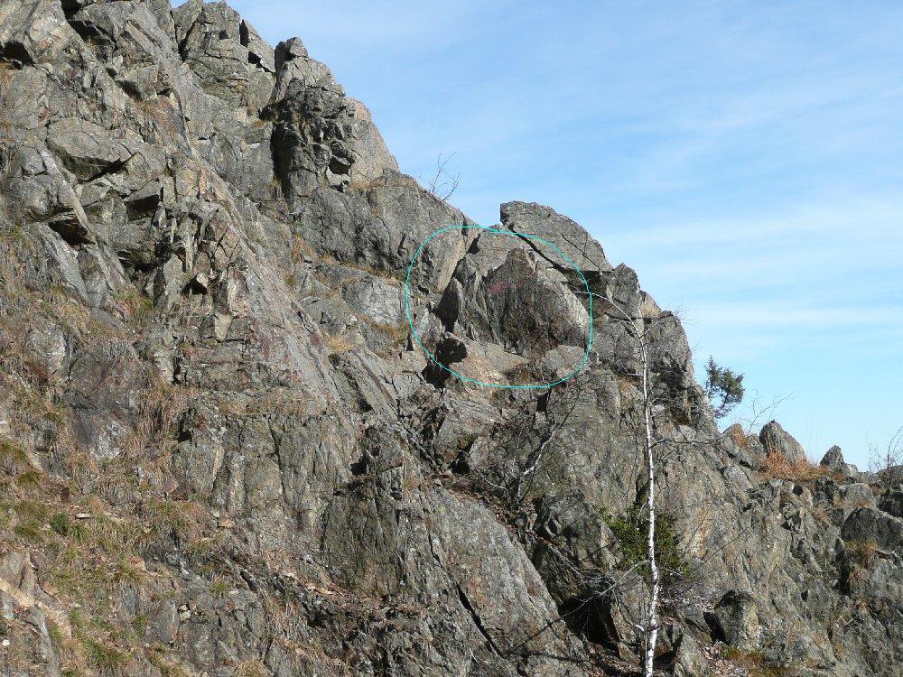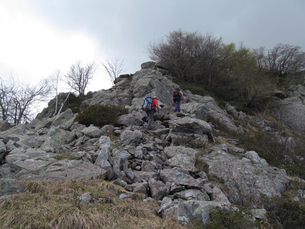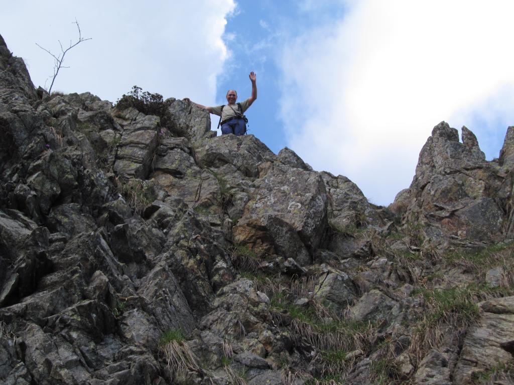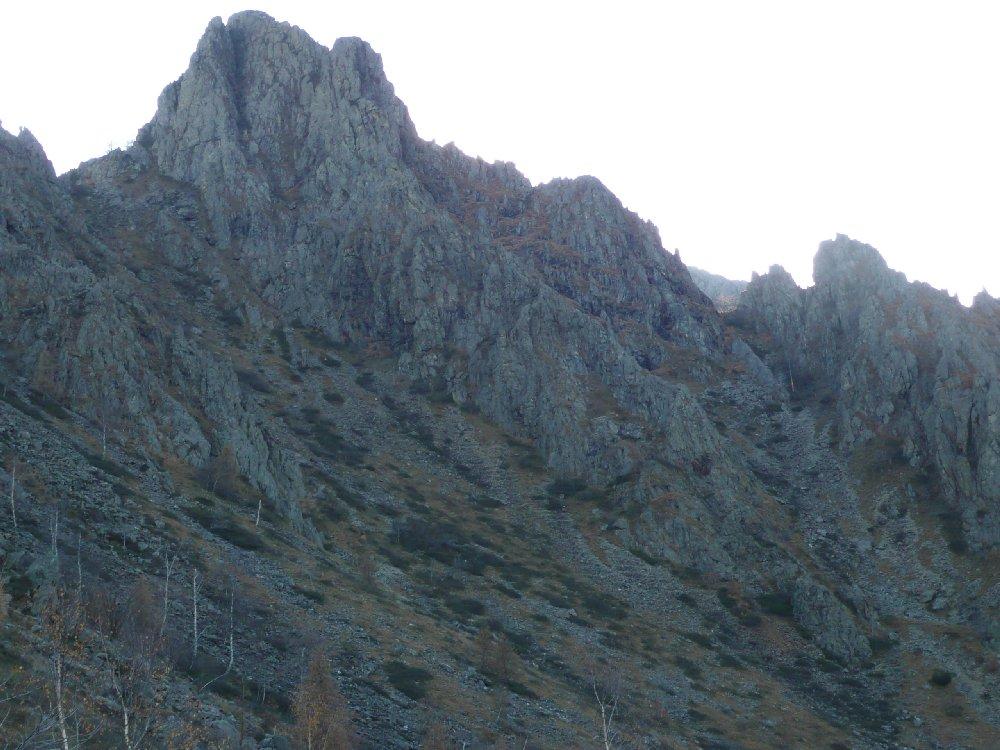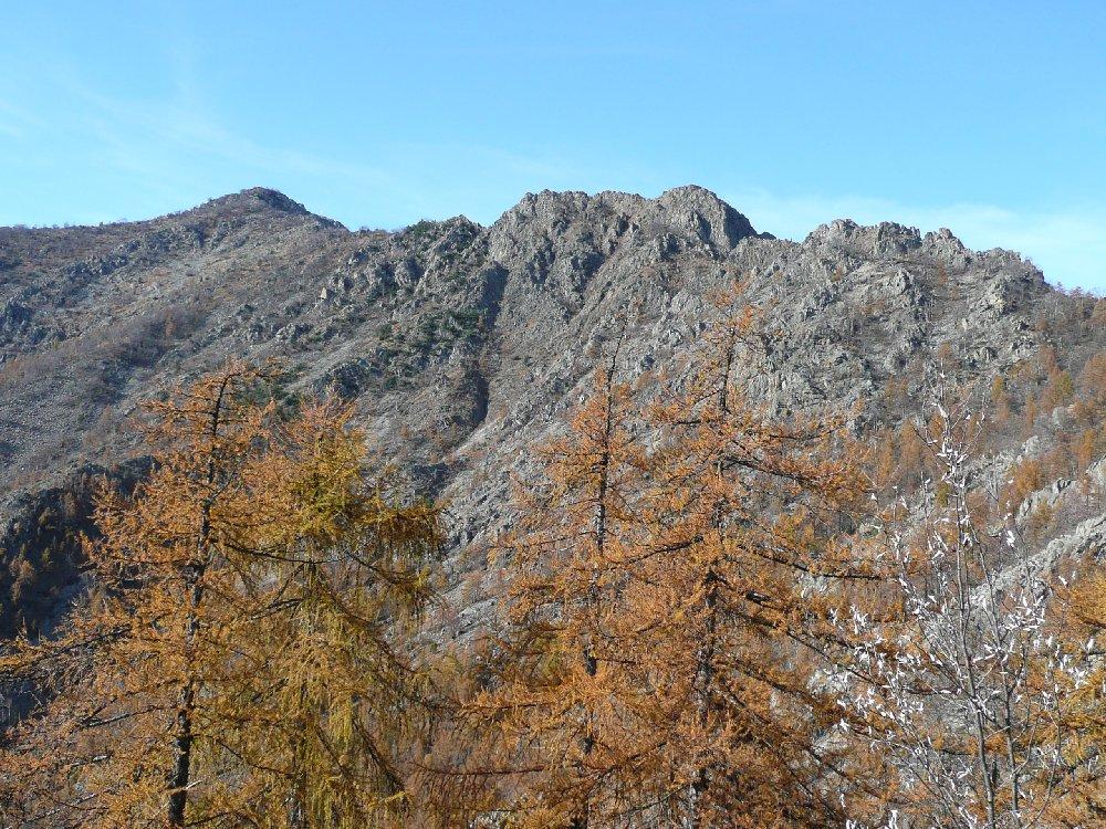 Da qui seguire le traccie sulla sinistra. Il bel sentiero che ci ha accompagnato fino ad ora non resta che un ricordo. Tenendosi sempre sul versante di Traves per traccie e cengie e aiutandosi sovente con le mani riusciamo ad evitare alcuni salti rocciosi fino a raggiungere per “facili” roccette la cresta e con un ultimo passaggio un poco esposto la croce della vetta (1494 m).