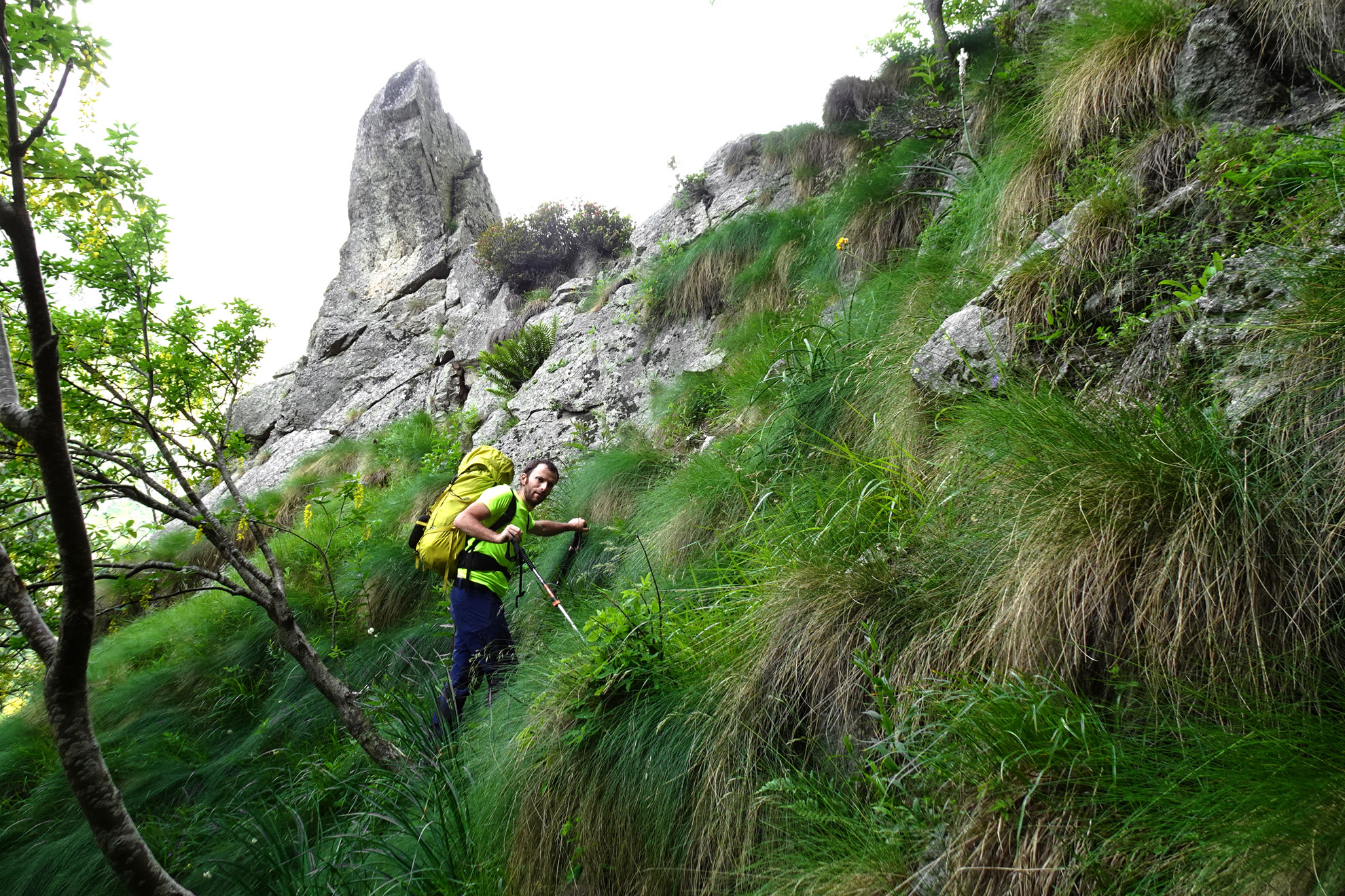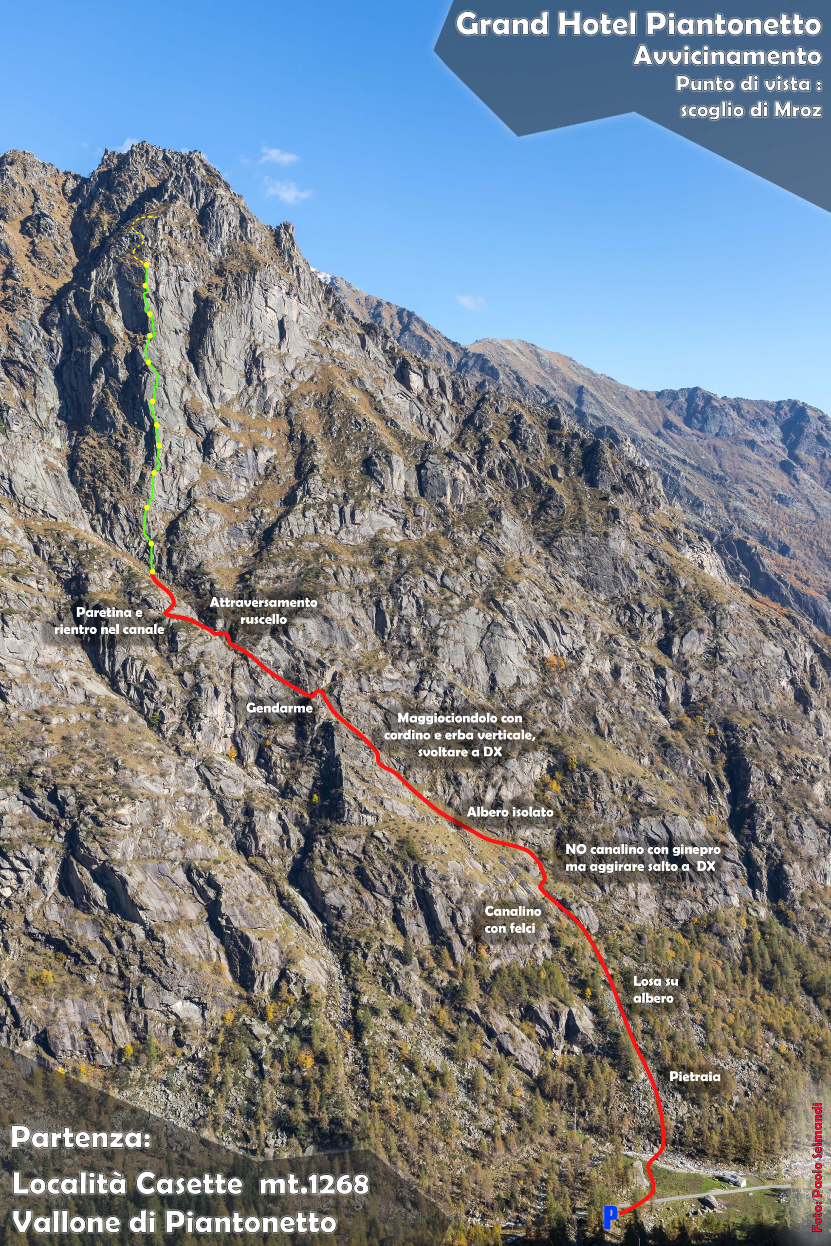 Si raggiunge quindi una zona prativa in estate adibita a pascolo delle capre, puntare ad una evidente betulla isolata(ometti). Si procede sempre verticalmente per prati e canalini fino a giungere ad una strozzatura dove l’erba è molto ripida per un paio di metri (albero con cordino), qui si piega a destra, sfruttando le provvidenziali radici sporgenti di un maggiociondolo (cordino) e si risale il canale per qualche altra decina di metri giungendo in vista di un caratteristico gendarme roccioso, sulla sinistra. Raggiungere la crestina che lo accoglie a monte e scavalcarla con qualche passo in discesa. Risalire qualche metro, segue una esile cengetta rocciosa, attenzione se bagnata, ed un tratto di sentiero/canale più evidente, fino a raggiungere una spalla rocciosa, ometto. Da qui puntare alla gola del torrente, che si raggiunge velocemente, siamo quasi all’attacco. Prima di attraversare il torrente, proseguire sulla sinistra idrografica ancora per qualche metro in salita, fino sotto un saltino di roccia e contro un grosso masso liscio (piccolo muretto a secco). Scavalcarlo e attraversare il torrente, poi seguire a mezzacosta per qualche metro verso sinistra i prati (albero caduto) e ricominciare quindi a salire tra i rododendri verso destra. Piegare leggermente a sinistra, una volta contro la paretina rocciosa, girare nuovamente in direzione del canale e forzare l’ultimo saltino con un breve passaggio verticale. Proseguire verso destra ritornando nel letto del torrente. Risalire per poche decine di metri la pietraia e reperire l’attacco della via, evidente per i segni di pulizia della roccia e per un chiodo a lama in un diedrino cieco, lasciato proprio per indicare l’attacco. (1h totale dal parcheggio, ma vista la complessità del terreno può rendersi necessaria anche un’ora e mezza).