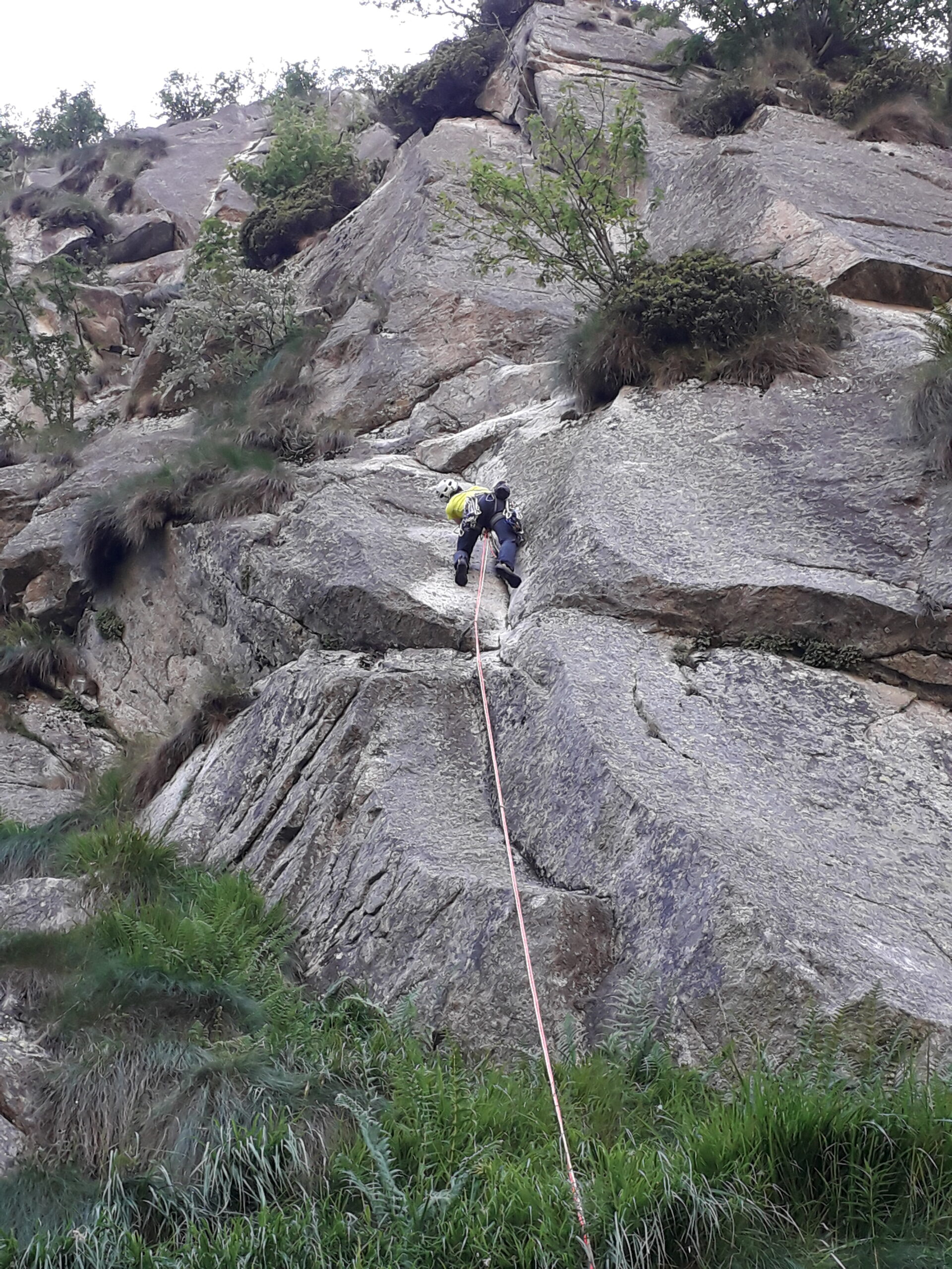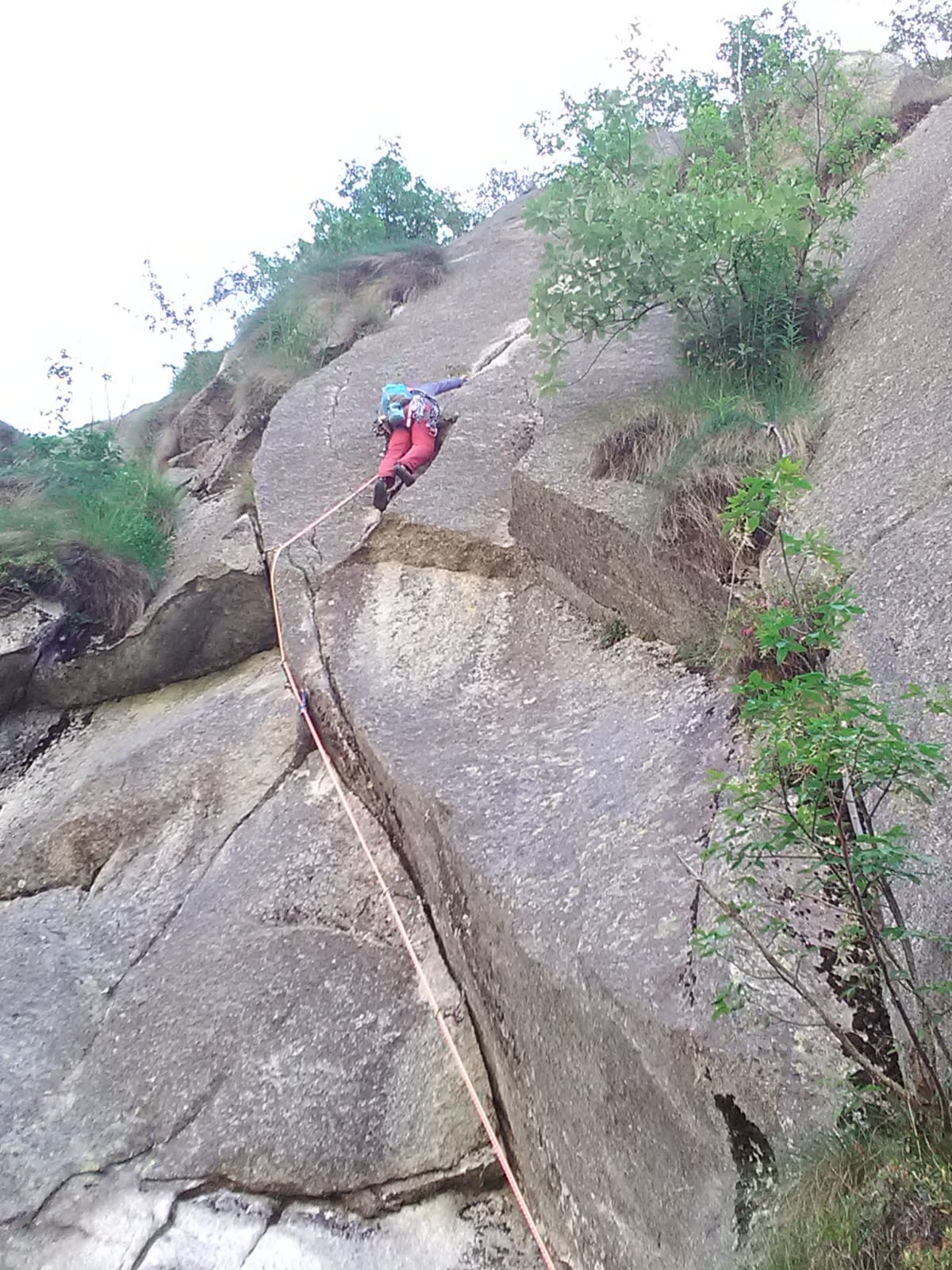 - L11 Si attacca leggermente a destra della sosta, sprotetto, e si segue in filo dello spigolo fino a raggiungere una cengia di rododendri, superarla con qualche passo arboreo e raggiungere la cima della parete. La prima sosta di calata si trova sulla destra, spit visibile, su una gigantesca lama di granito. Tiro onestamente non memorabile ma che permette di uscire dalla parete e volendo di raggiungere a piedi il gendarme ben visibile dall’auto. 35mt 6a