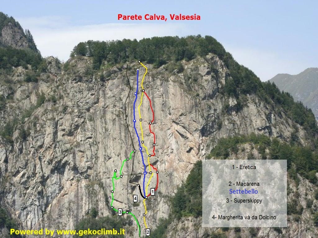 La traccia è ripida e poco marcata, in qualche tratto un po’ esposta. Di fatto si fa una diagonale da sinistra verso destra, passando sopra a delle placchette di roccia e restando sopra una zona erosa. Seguendo attentamente i segni non ci si perde e si rientra nel canale principale sotto la parete Calva. Seguendo sempre i segni che vanno sempre verso destra si arriva all’attacco delle vie macarena, eretica, settebello, margherita…, free dolcino, nei pressi di una targa metallica con i nomi.