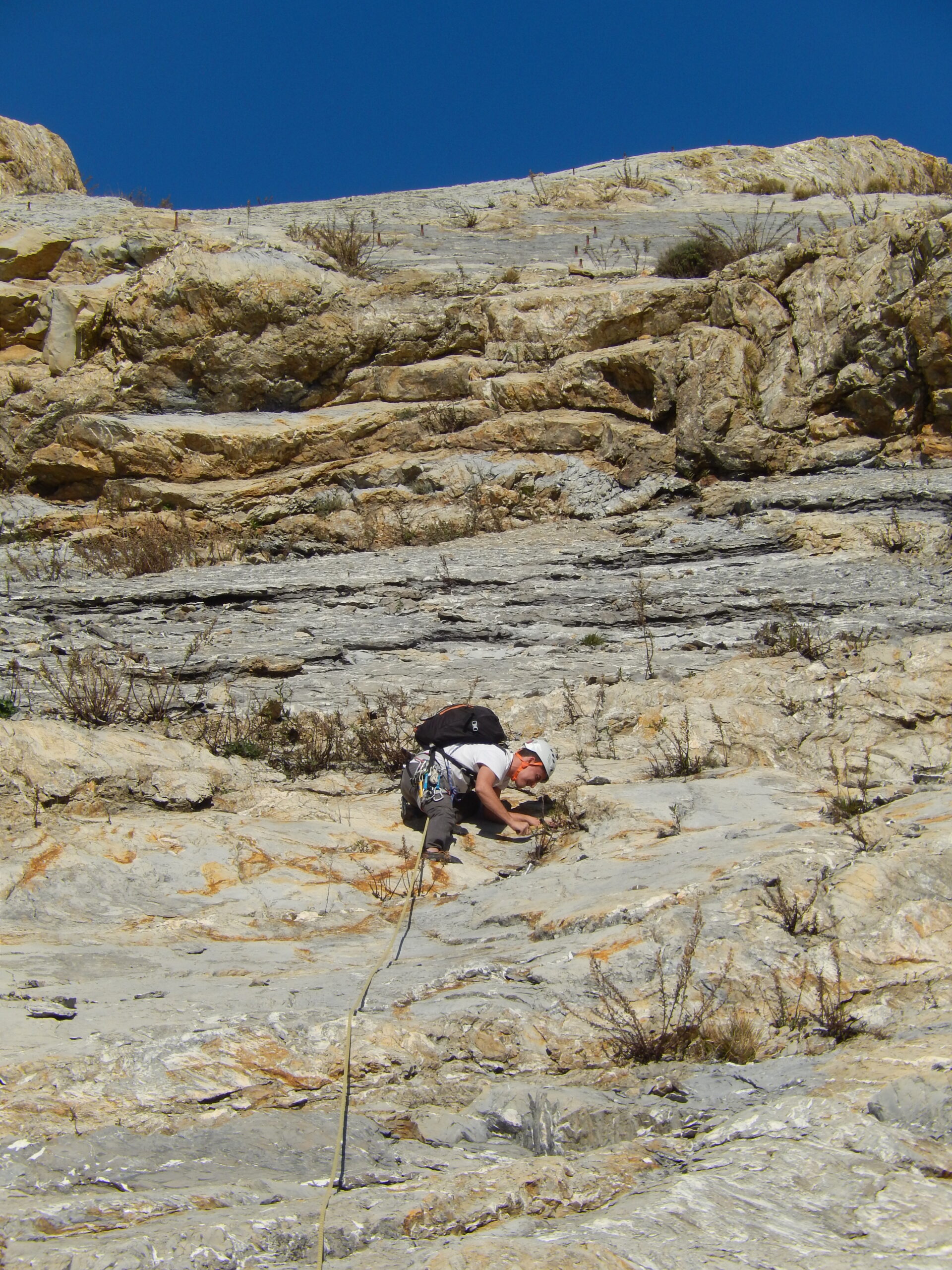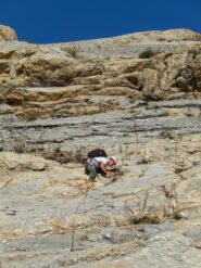Possibile da affrontare anche slegati, per fini didattici è possibile suddividere la via in 4 tiri e attrezzare le soste sulle numerose fessure presenti, l’ideale però rimane procedere in conserva.
