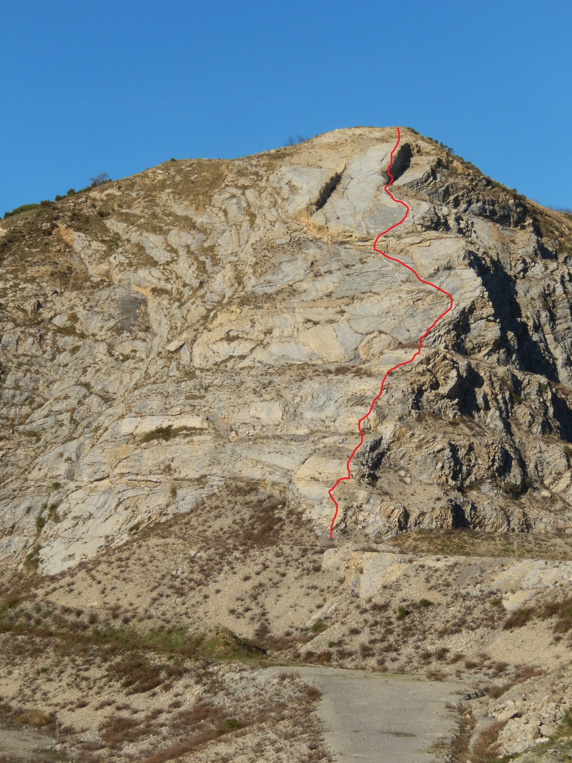 La via risale il lato destro della parete. Prima parte molto appoggiata, priva di difficoltà, dopo circa 20 metri, in corrispondenza di uno scalino, è presente un chiodo a cui è possibile assicurarsi. Si prosegue tenendo il lato destro risalendo di altri 40-50 metri, numerosi sfasciumi sulla via. In prossimità della parte centrale della si piega leggermento verso sinistra, andando a guadagnare il centro della parete per affrontare il gradino che porta alla placca finale (passo di III, ma aggirabile), quindi proseguendo sempre dritti si rimonta il placcone finale e si arriva in cima.