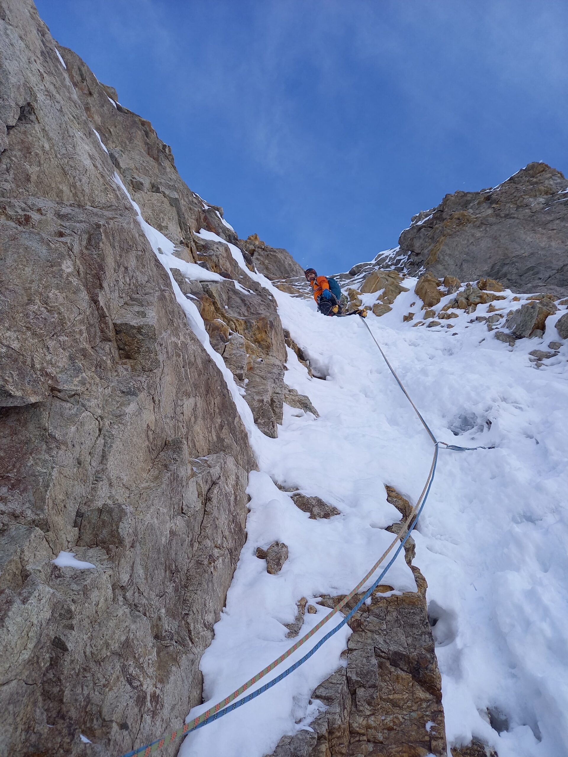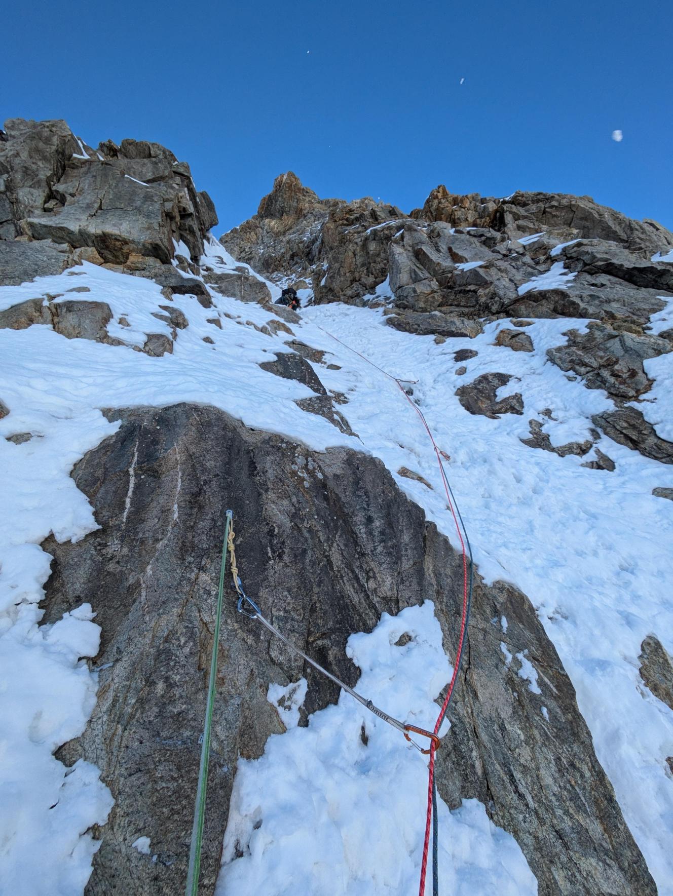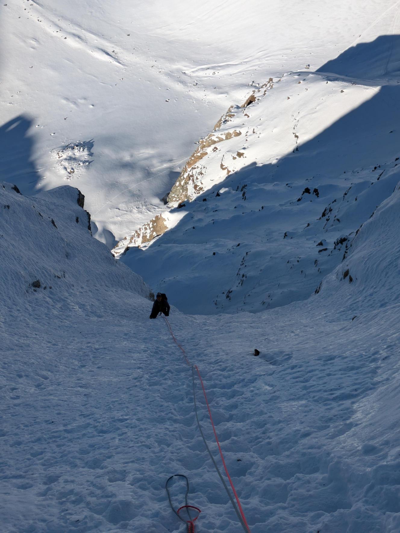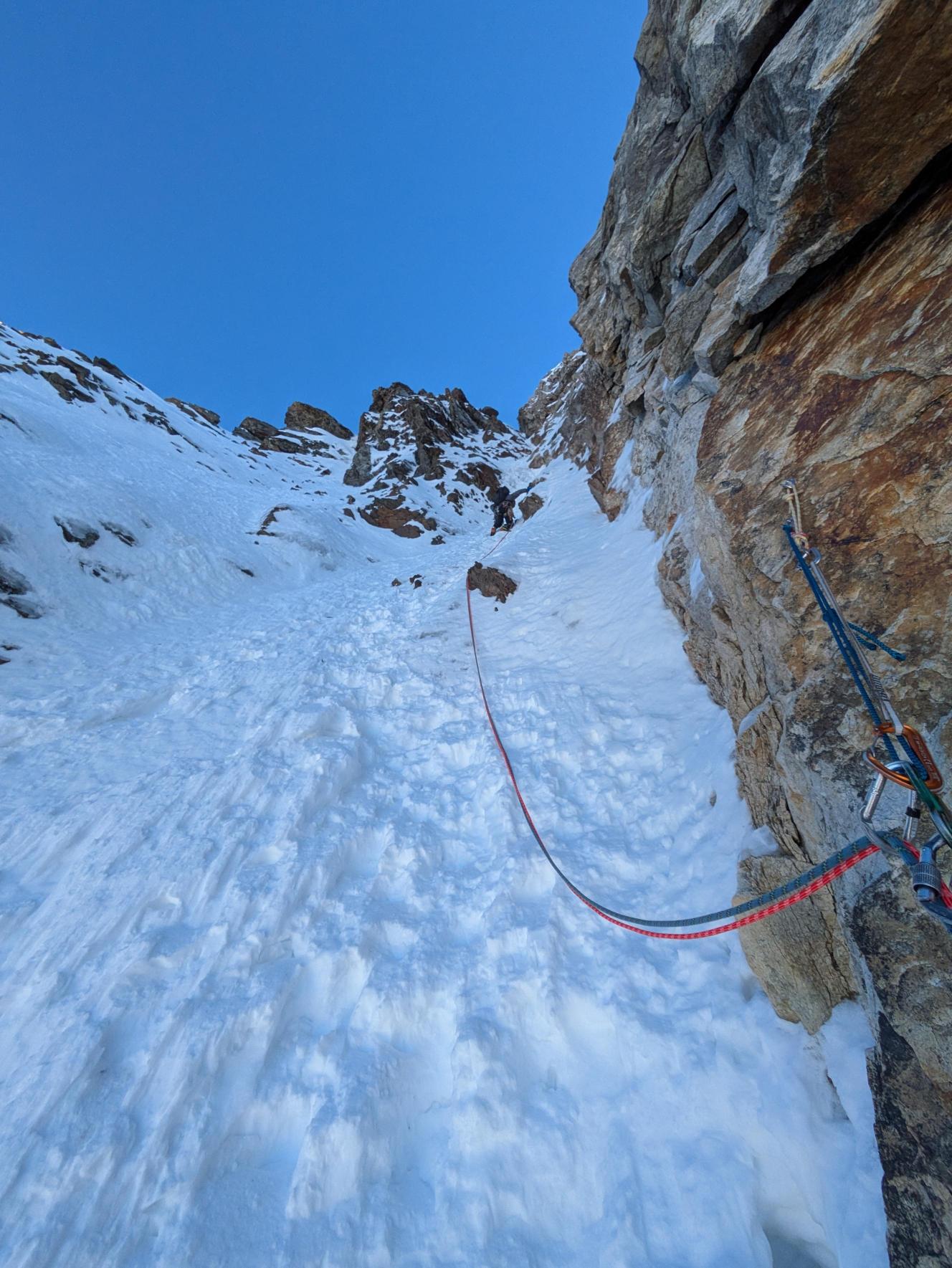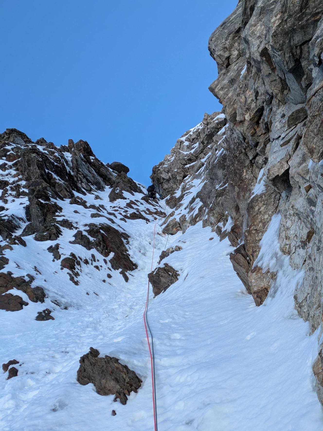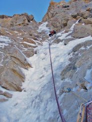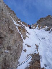 - 3° tiro: salire il diedro sopra la sosta, alla data della nostra ripetizione era un bel muro di neve e ghiaccio a 85°, ma spesso un diedro da salite in misto. Proseguire poi per facile canale fino alla sosta a spit su muro di roccia. 85° o M4; 55m.