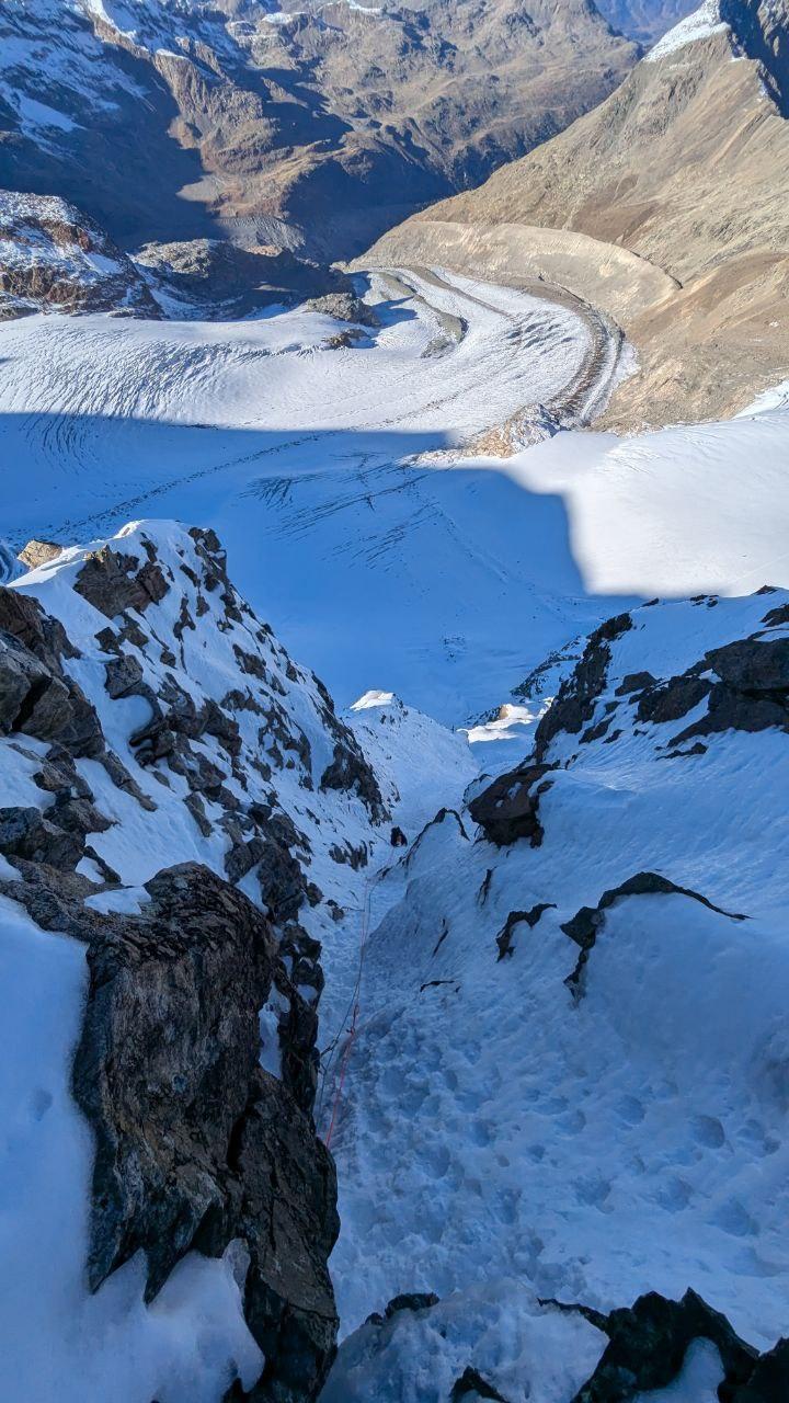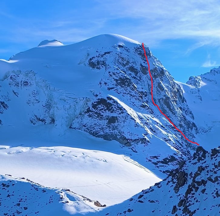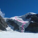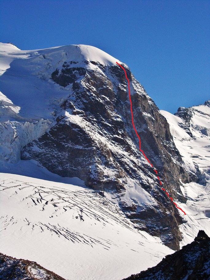 Dalla cima seguire verso sinistra compiendo un grosso cerchio in senso antiorario, con un traverso esposto sopra i seracchi si raggiunge il naso di ghiaccio e si prende il canale che riporta al ghiacciaio del Palù.