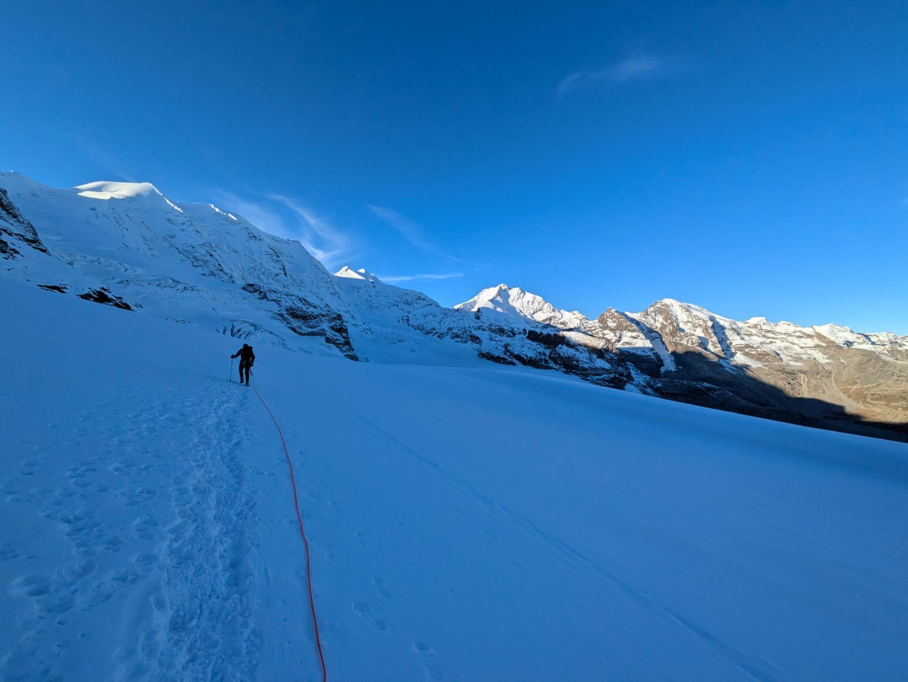 In pochi metri raggiungere la calotta sommitale e recuperare il compagno a spalla.