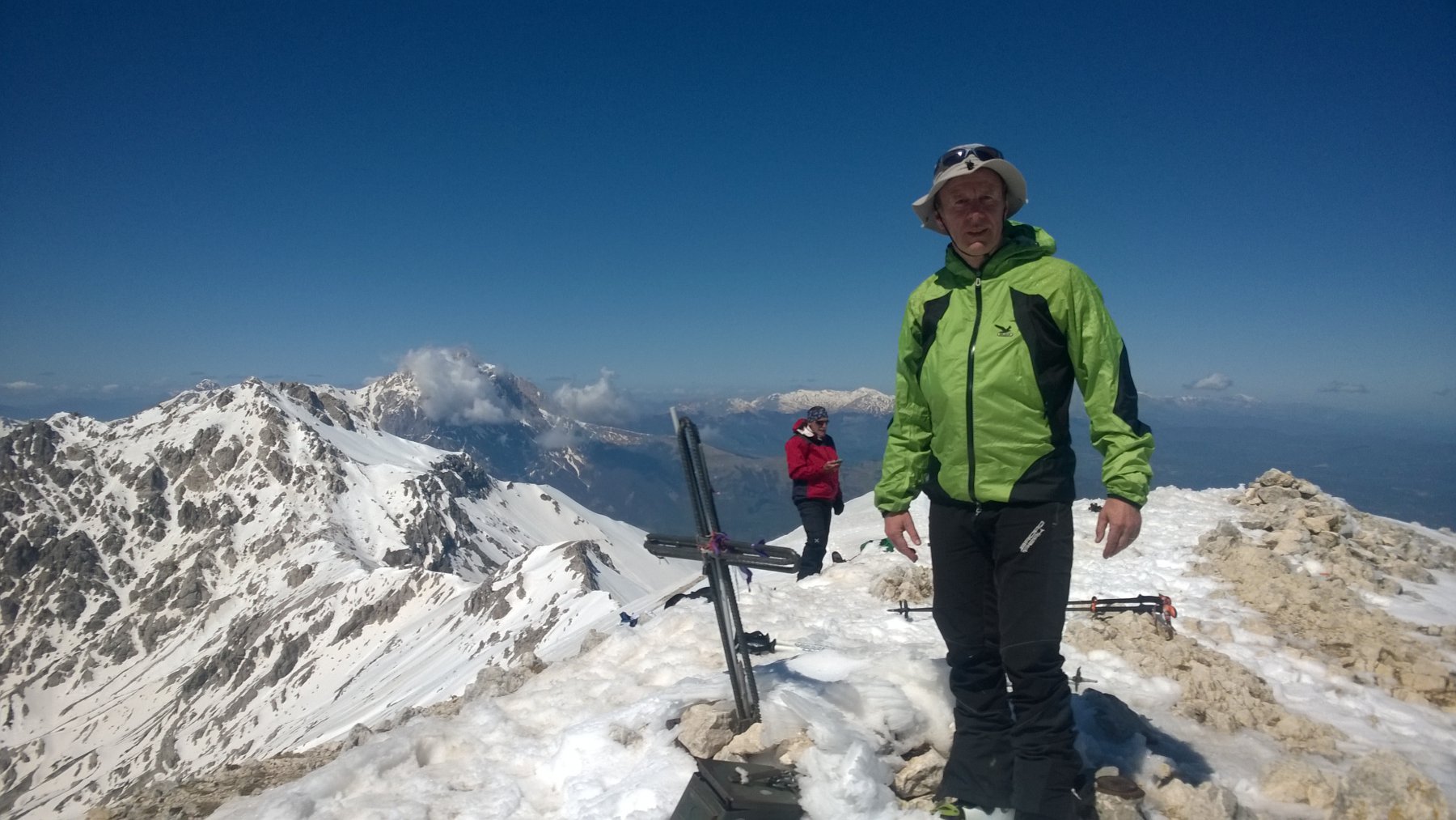 rimane poca neve, portage con ramponi e senza, sino ai canaloni con lingue di neve, da li in poi si sale sci ai piedi sino in cima.