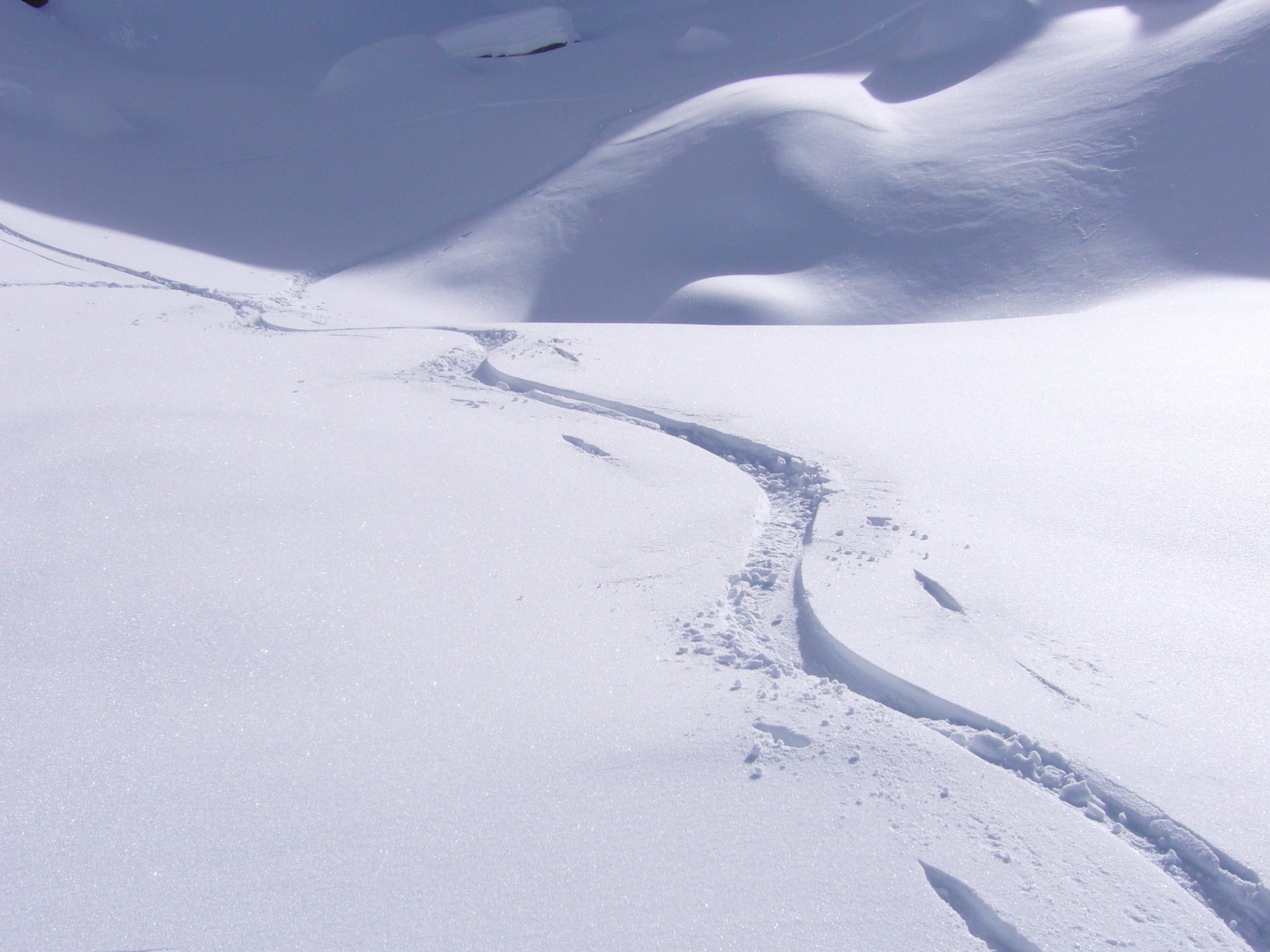 Dal colle della Barma scesi dal Malpartus su neve primaverile. Busa al limite.