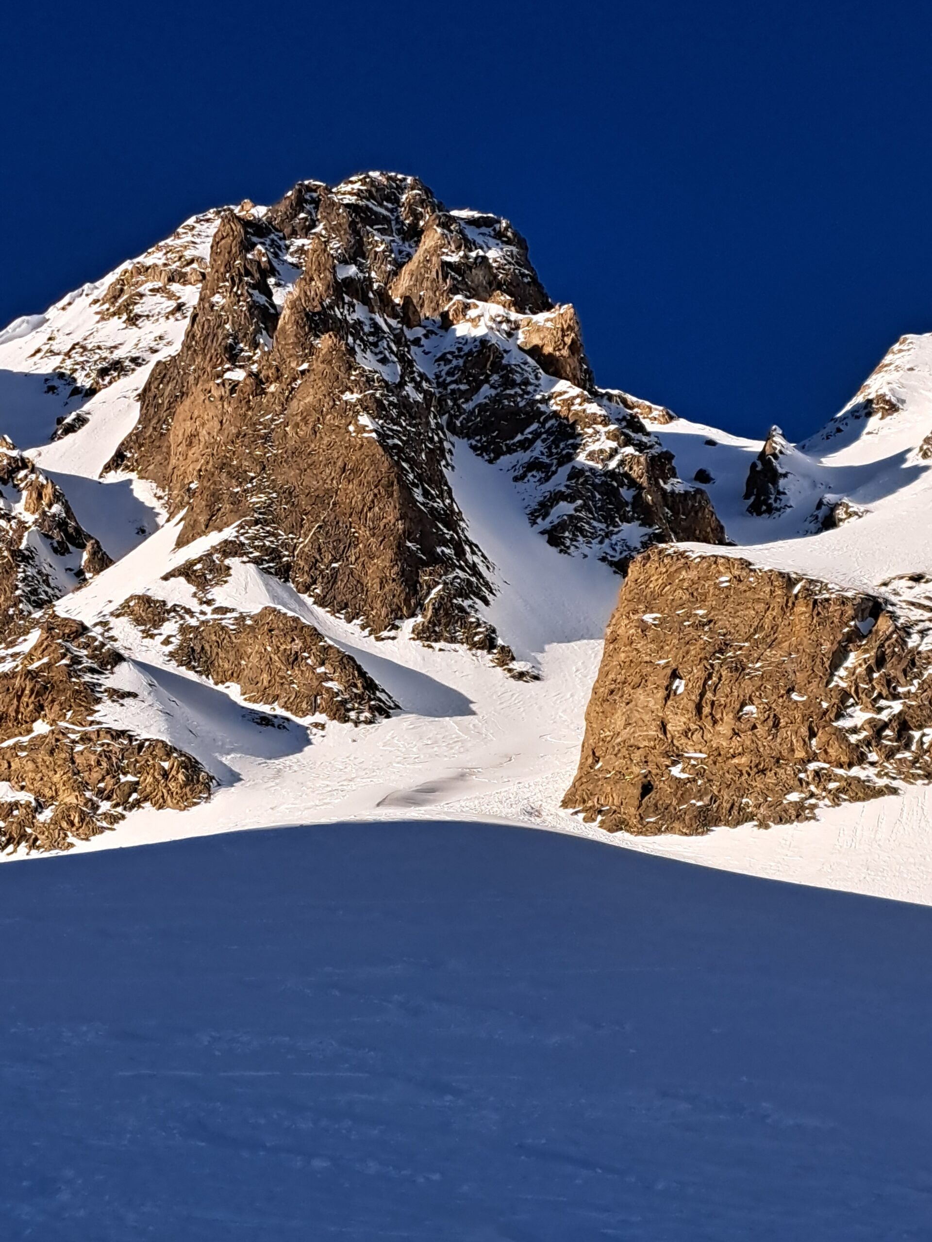 Da Alte Stafel salire verso Furculti e proseguire sulla strada sterrata, posta sopra il Lago di Morasco, che permette di entrare nel vallone di Nefelgiù (pericoloso con forte innevamento). Raggiunta l’Alpe di Nefelgiù proseguire nel vallone in direzione della bocchetta omonima fino a circa quota 2450 m. dove si devia ad Ovest verso l’evidente canale che scende dalla P.ta dei Camosci. Salire il conoide con gli sci e poi, entrando nel canale (tratto centrale di 40°), proseguire a piedi (utili i ramponi). Quasi al termine del canale deviare a destra e raggiungere la sella a Nord della cima per poi raggiungere quest’ultima salendo per la dorsale Ovest; con buon innevamento è possibile giungere direttamente in vetta proseguendo per il canale (45°).