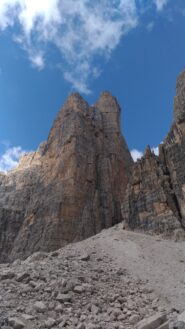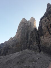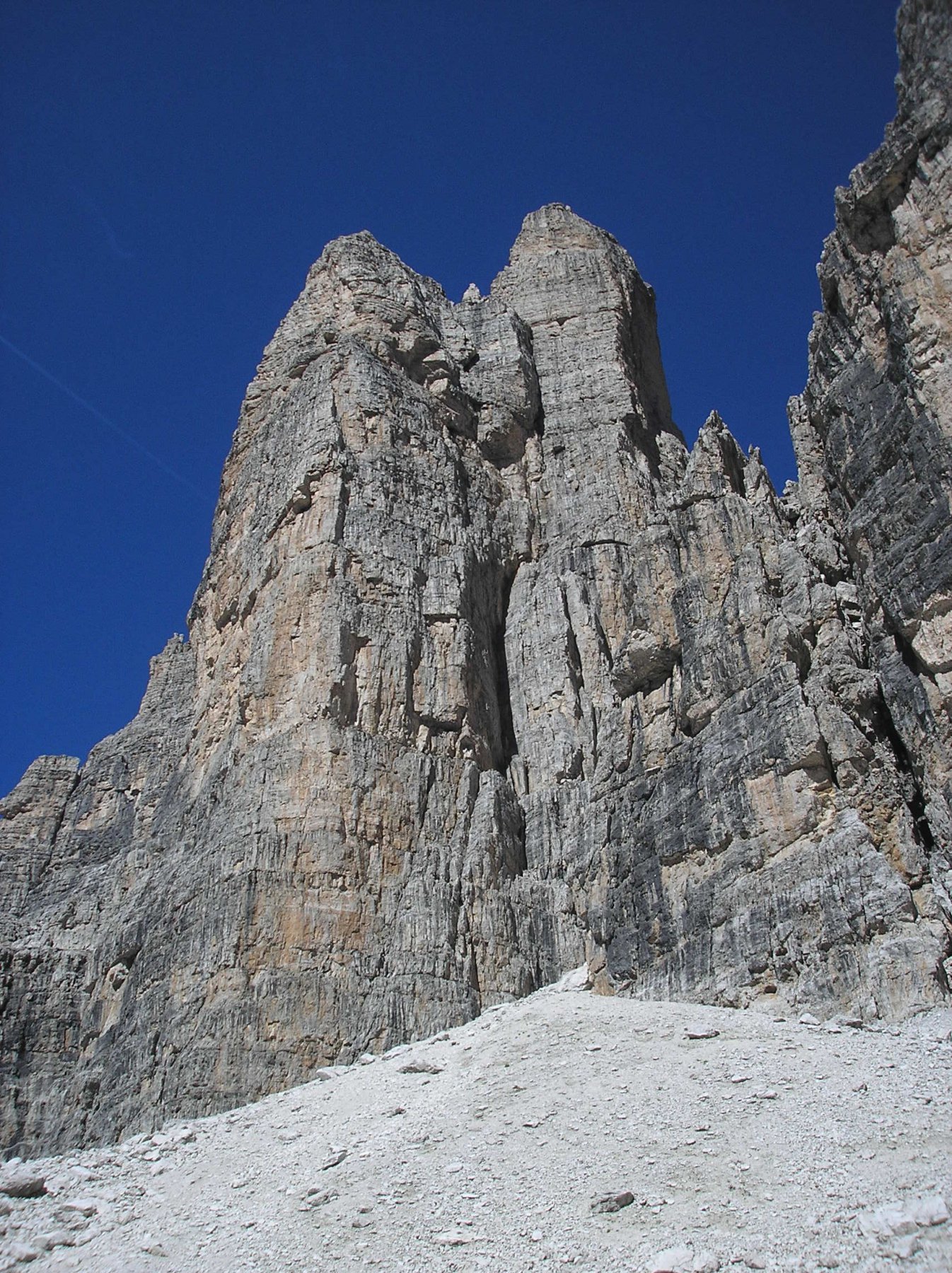 Dal rifugio Brentei si percorre il sentiero 318 che porta verso le Bocchette, abbandonandolo per una traccia su ghiaione che porta verso lo spigolo (circa 45' dal Brentei).