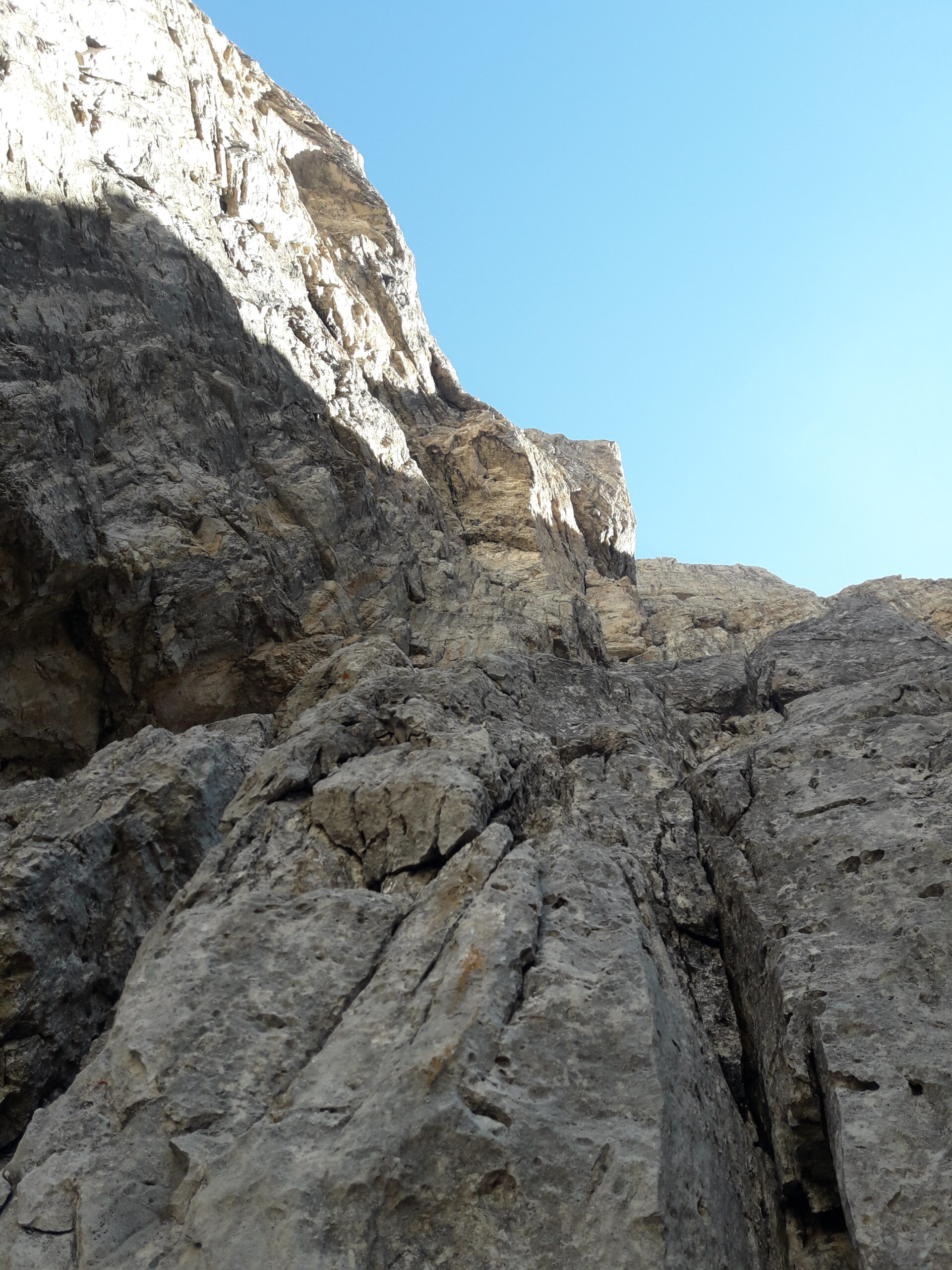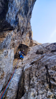 - L14: conviene uscire dal diedro, dritti, e non andare all’originale nicchia prima dello spallone (uscita difficile in strapiombo, il buco è franato!!!), sostare poi all’altezza dello spallone in una grossa nicchia (40m, IV)