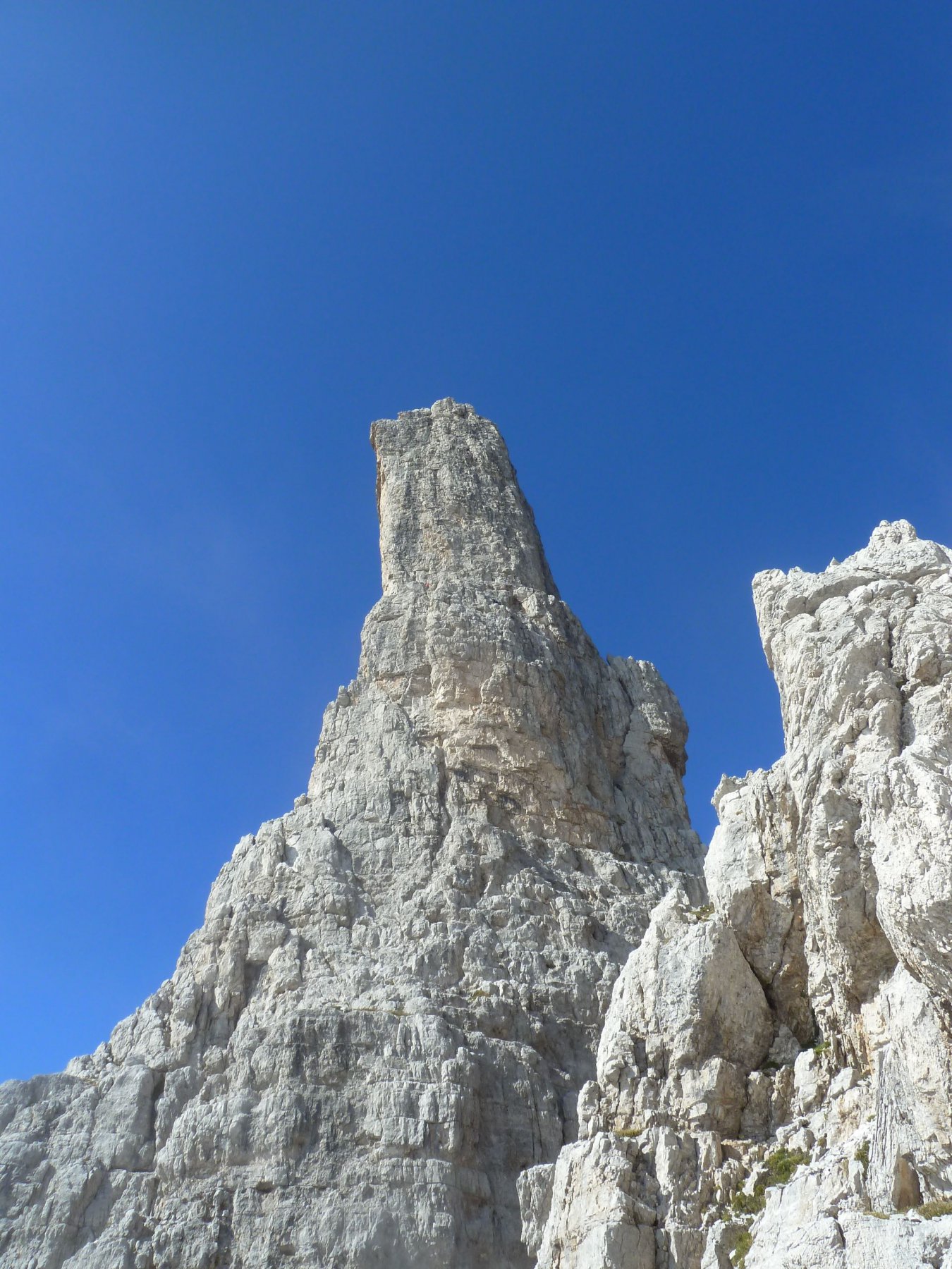 - 3° tiro – “Spigolo Fox”: salire a destra della sosta, raggiunta una cengia abbandonare la via Normale e continuare lungo il filo dello spigolo, piegando progressivamente verso destra, sino a raggiungere la sosta (2 chiodi+fettucce, 1 sosta di calata). 50 m., III, IV.