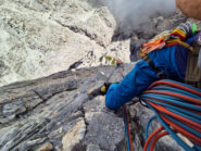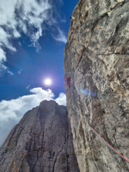 - 6° tiro: spostarsi a sinistra in prossimità dello spigolo poi salire in verticale sino alla sosta in corrispondenza di una piccola nicchia gialla. 30 m., V+, VI (oppure V+/A0), 8 chiodi (+ possibile sosta intermedia con 3 chiodi sotto al passaggio chiave).