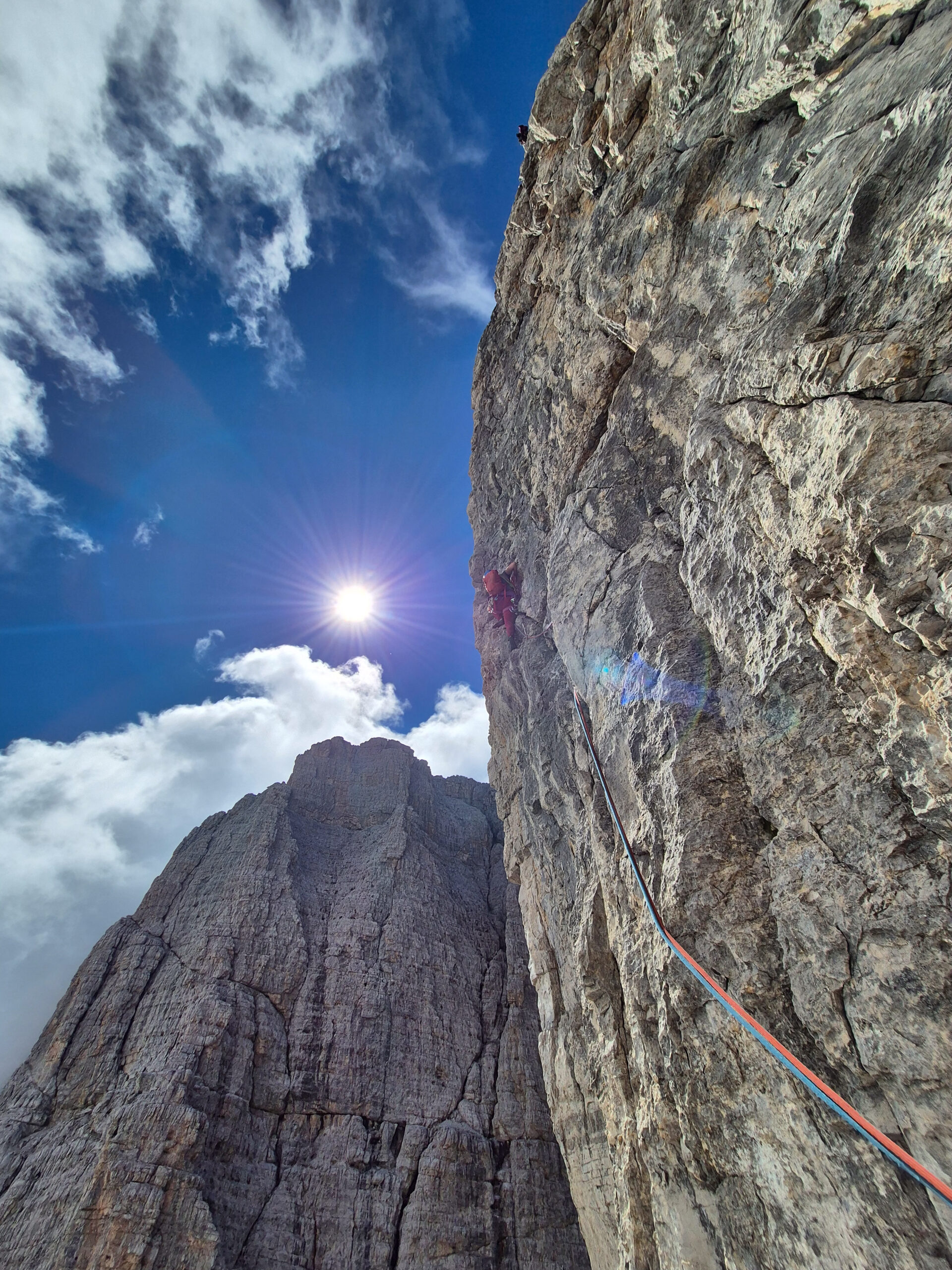 - 7° tiro: superare lo strapiombino a destra della sosta e poi obliquare a destra in direzione di un diedro inclinato che si segue sino al suo termine. Sostare (3 chiodi) alla base di una placchetta. 50 m., V+, IV+, 7/8 chiodi.