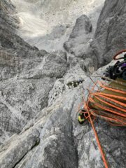 - 7a. calata (evitabile): 30 m fino al canale detritico poco sotto la bocchetta del Campanile Basso.