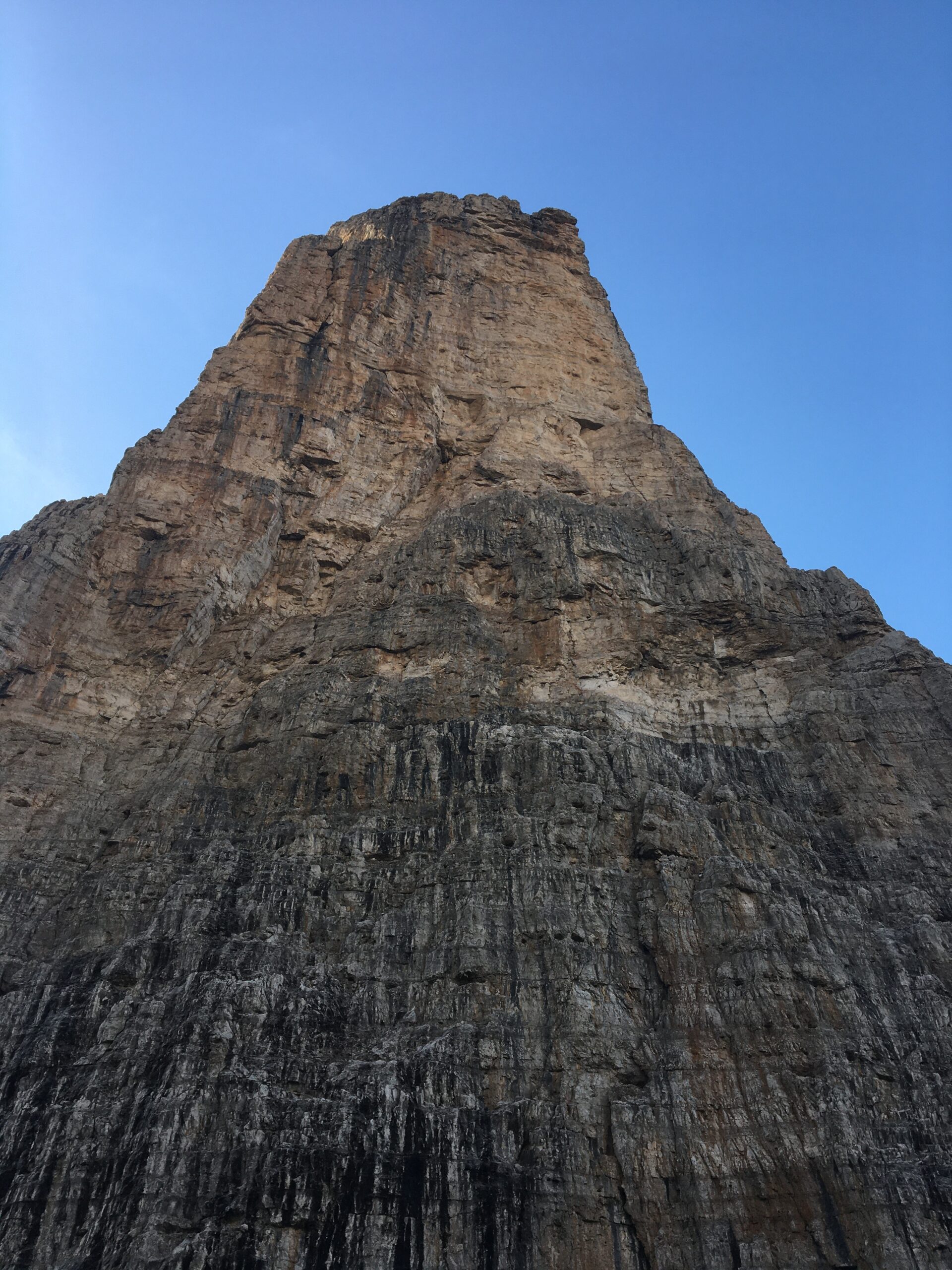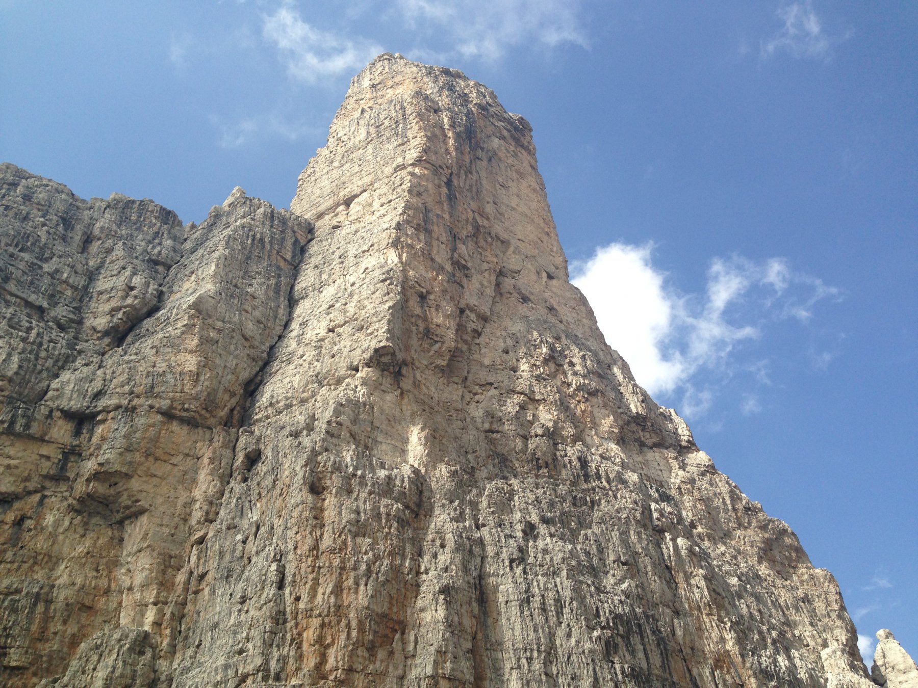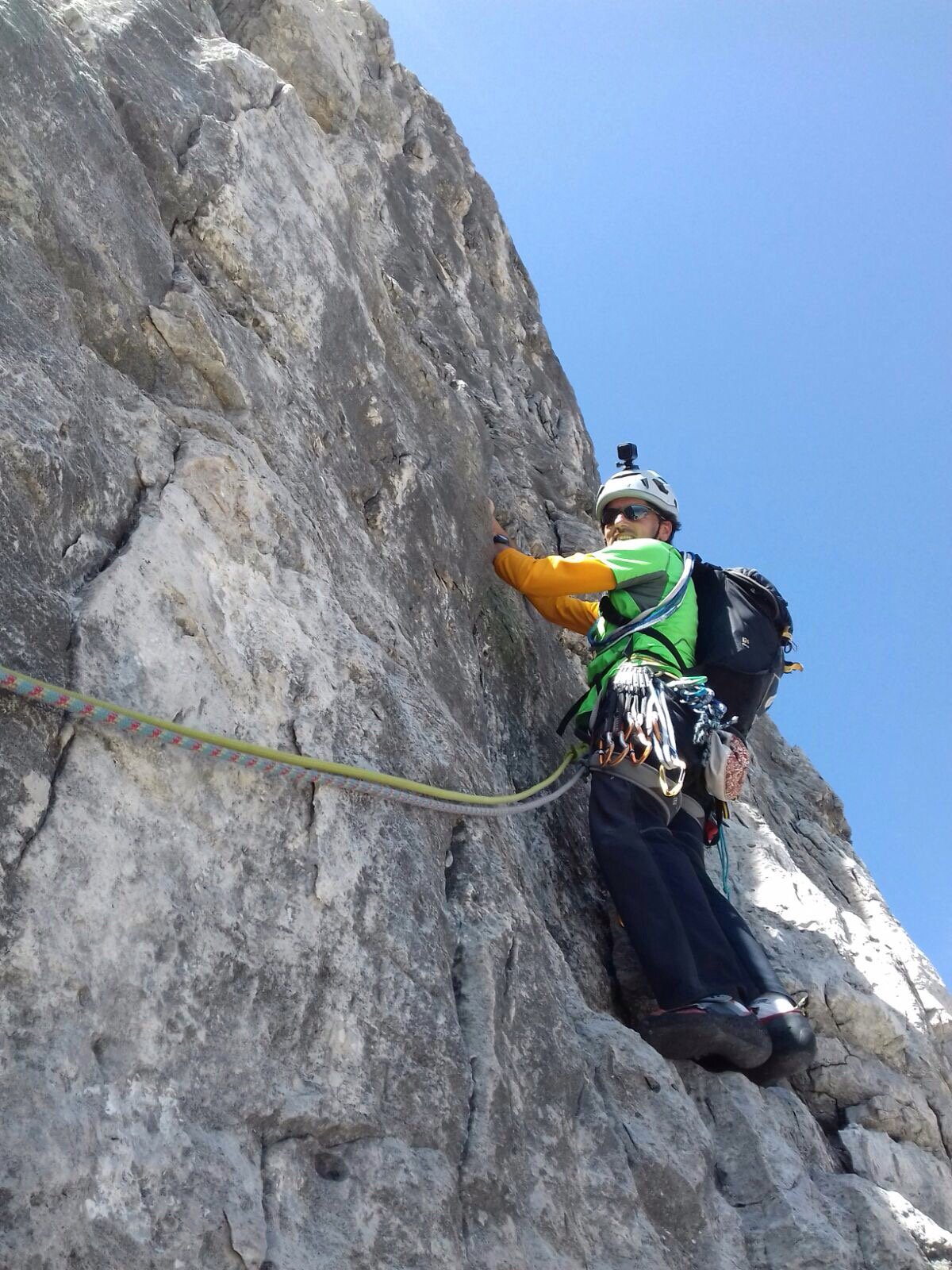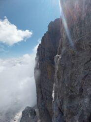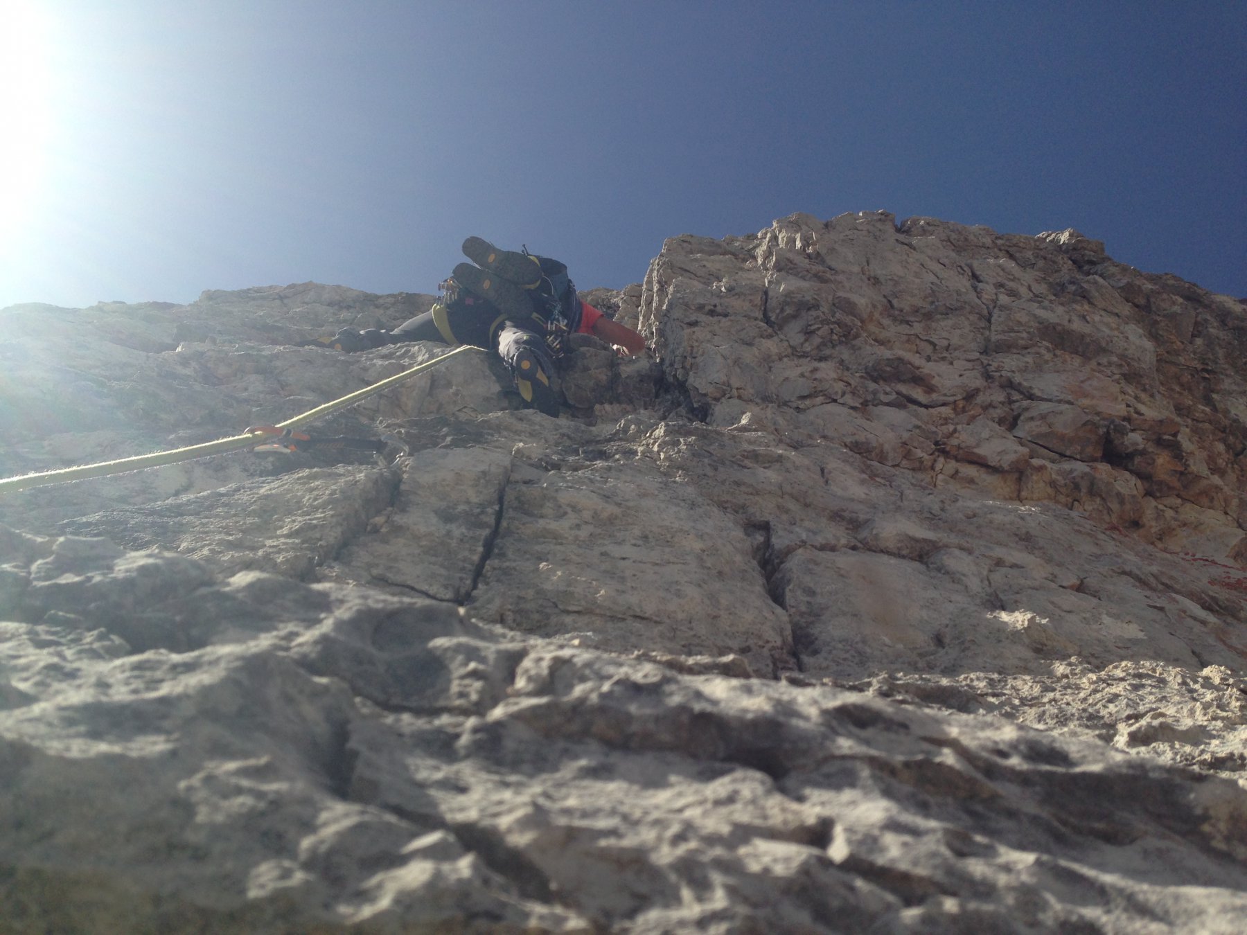 L1, 35 m – Si sale in verticale poi obliquando leggermente a sx (V-, 3 ch.); in vista di un tettino a sx, sotto il quale si trova la sosta, la si raggiunge traversando in massima esposizione (delicato, V+, 1 ch. con cordino in alto) con un’ampia spaccata.