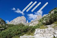 L3, 35 m – Si sale sopra la sosta (subito 1 ch., IV+) e si prosegue all’incirca in verticale o leggermente a dx (IV+, 1 ch.) fino a reperire la sosta con 2 ch. su un terrazzino.