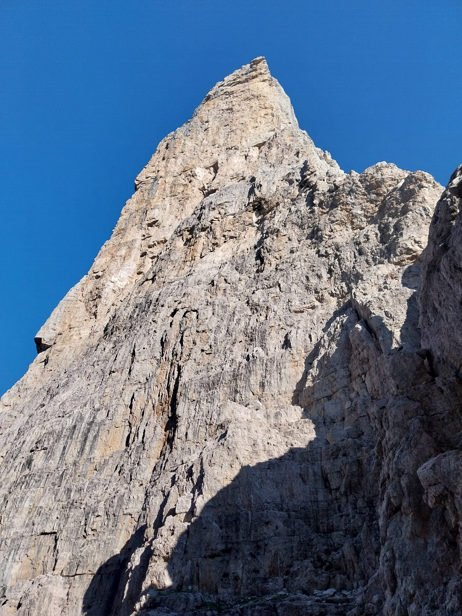 L4, 45 m – Si traversa a sx portandosi verso l’evidente camino-diedro finale; prima di entrarvi si supera una placchetta nera delicata (V-, trovata bagnata). Si sale tutto il camino (III+/IV) e si esce sull’ampia vetta, sulla destra sosta su kevlar attorno a un masso incastrato (integrabile con friends).