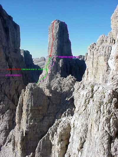 bella salita sulla “guglia” del Brenta,tanto celebrata e sempre affascinante, ottima la descrizione qui sopra, nulla di segnalare se non la quantità di soste ben attrezzate per le calate che permettono di fare doppie sia con 2 corde che con una singola, in via eccetto sulla parete Pooli e la Ampfer i chiodi sono ben pochi, le soste come già detto abbondano…