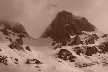 risaliti faticosamente con un caldo mostruoso fin sotto la parete. risaliti attraverso pendii innevati ma mal messi: neve non portante e slavinosa.