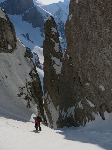 Il canale è ancora completamente in neve; solo in alto il manto è più sottile e di qualità peggiore, presto si scopriranno le rocce.