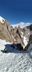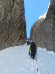 Avvicinamento su neve un po’ sfondosa ma tutto sommato accettabile. Nel canale condizioni buone, neve portante. Il primo salto di roccia è coperto e ai sale senza difficoltà; il secondo lo abbiamo affrontato a dx proteggendolo con due friend e una fettuccia su spuntone.