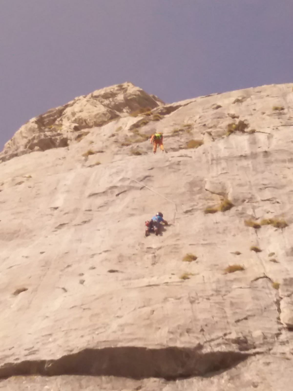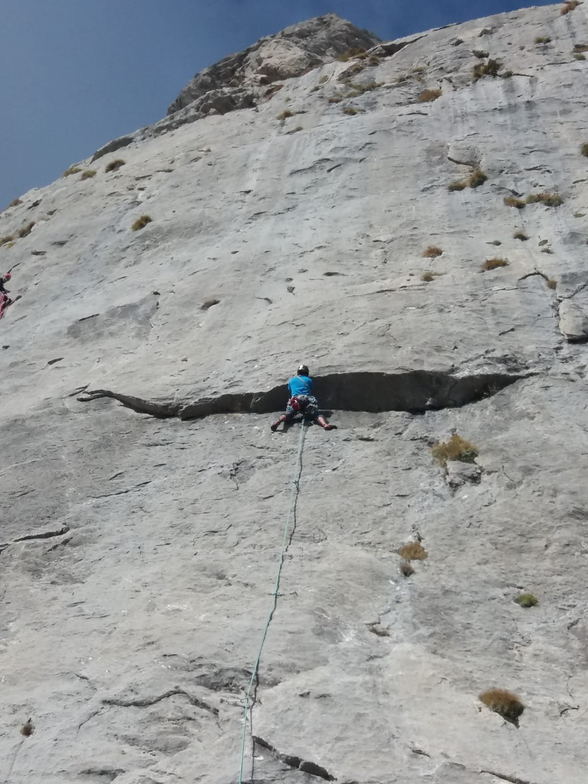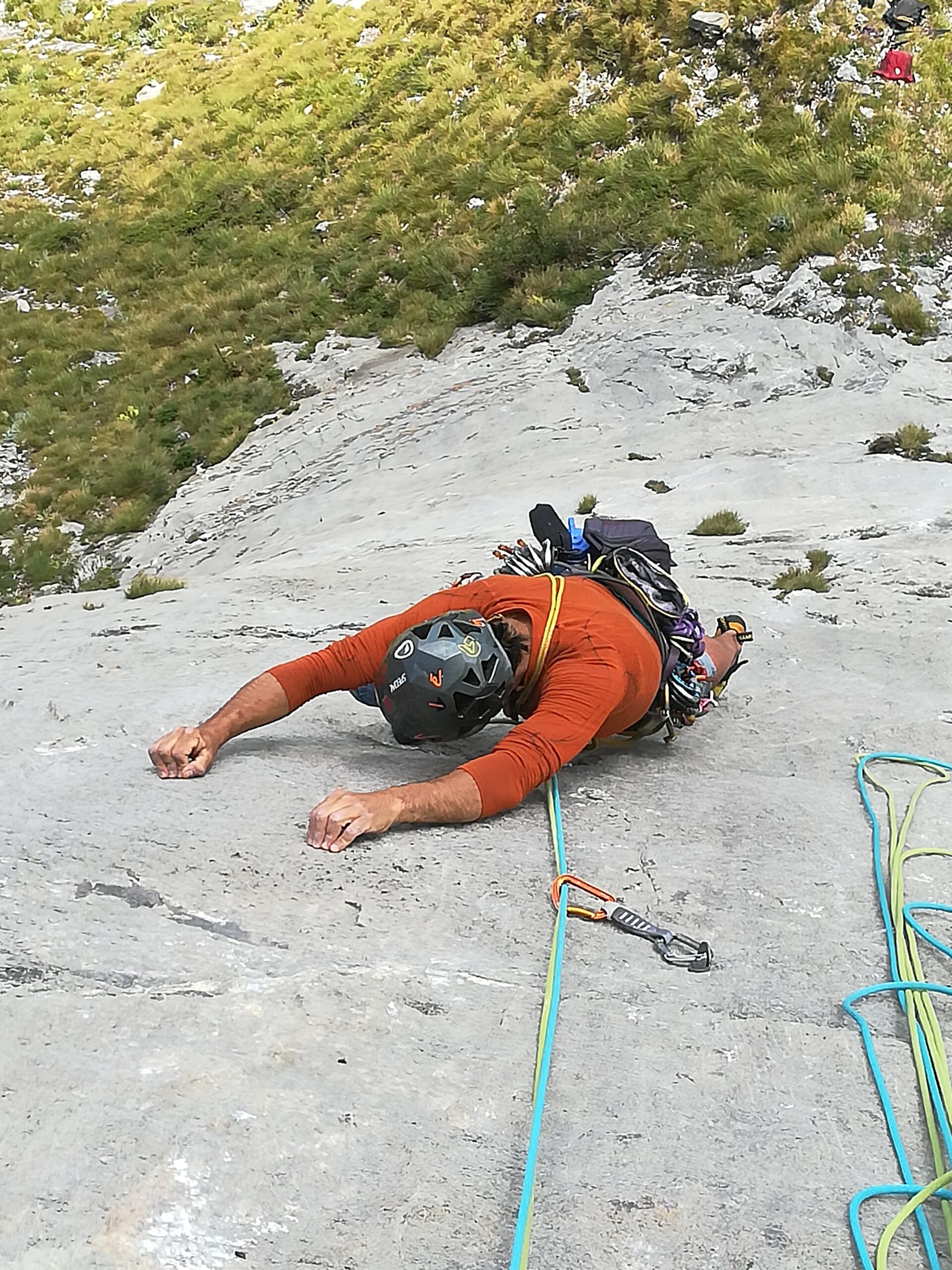 - L5) erba, placca a buchi, traverso a dx, chiodato lungo, 6b+