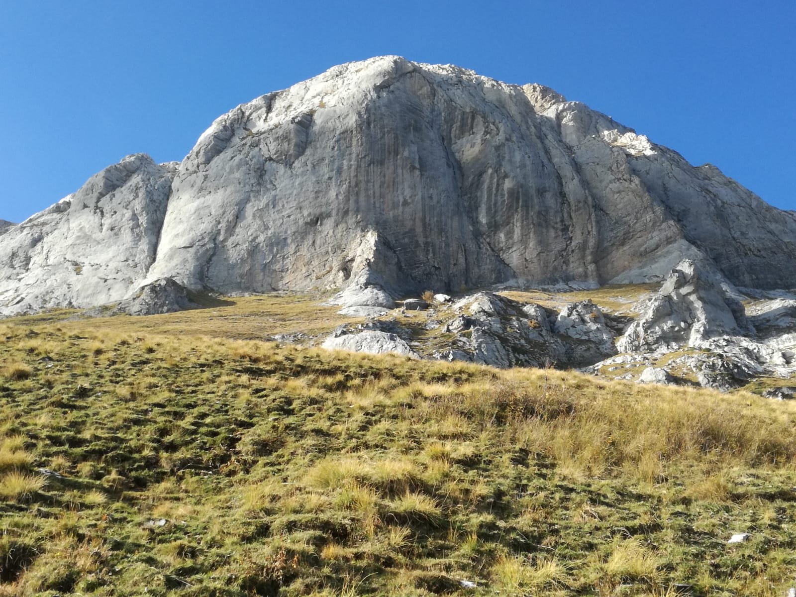 Si segue un costone erboso poi una traccia a sinistra ( ometti), fino a raggiungere un canale ghiaioso ed erboso. Si risale il ripido canale fino alla base della parete.