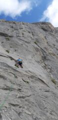 Un po’ di storia, per spiegarne la genesi. Ho scalato per parecchi anni sullo Scudo dei Campanili e mi cadeva sempre l’occhio su una linea lì al centro, a destra di “Ci hai pensato”, i fix c’erano, ma non la vedevo mai scalare da alcuno. Sapevo che l’aveva chiodata Matte Canova, assieme a Gigio Gagliardi nel 2002, durante una calata di perlustrazione. Chiesi il permesso a Matte di risistemarla, anche variandone la linea ed il posizionamento delle soste, e lui acconsentì volentieri; acconsentì anche al cambio nome: JMC è una dedica al compianto Jean Michel Cambon, scomparso il 20/03/2020 mentre chiodava per il popolo. E su questa via abbiamo cercato di fare un’opera uguale, rendendola accessibile ai più (qui sta il motivo dello spit che risulta in più nella parte in cui confluisce per poco con “Ci hai pensato”. Ci abbiamo appunto pensato se metterlo o meno, e alla fine lo abbiamo aggiunto per rendere la chiodatura della via omogenea, chi non è d’accordo, può non moschettonarlo, oppure, talebanamente toglierlo).