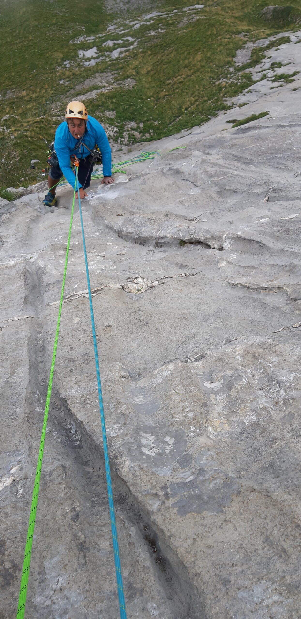 Comunque, con Marco Valente abbiamo iniziato a lavorarvi nel 2019, partendo dal basso, trasportandoci sempre addosso trapano, fix, soste, friends, zappa (usata parecchio nei due tiri finali), martello e carabattole varie. E ogni volta portandoci ‘sta roba su e giù per i pratoni scoscesi. Un bel mazzo quindi, ma ci pareva di star facendo qualcosa di bello e meritevole.