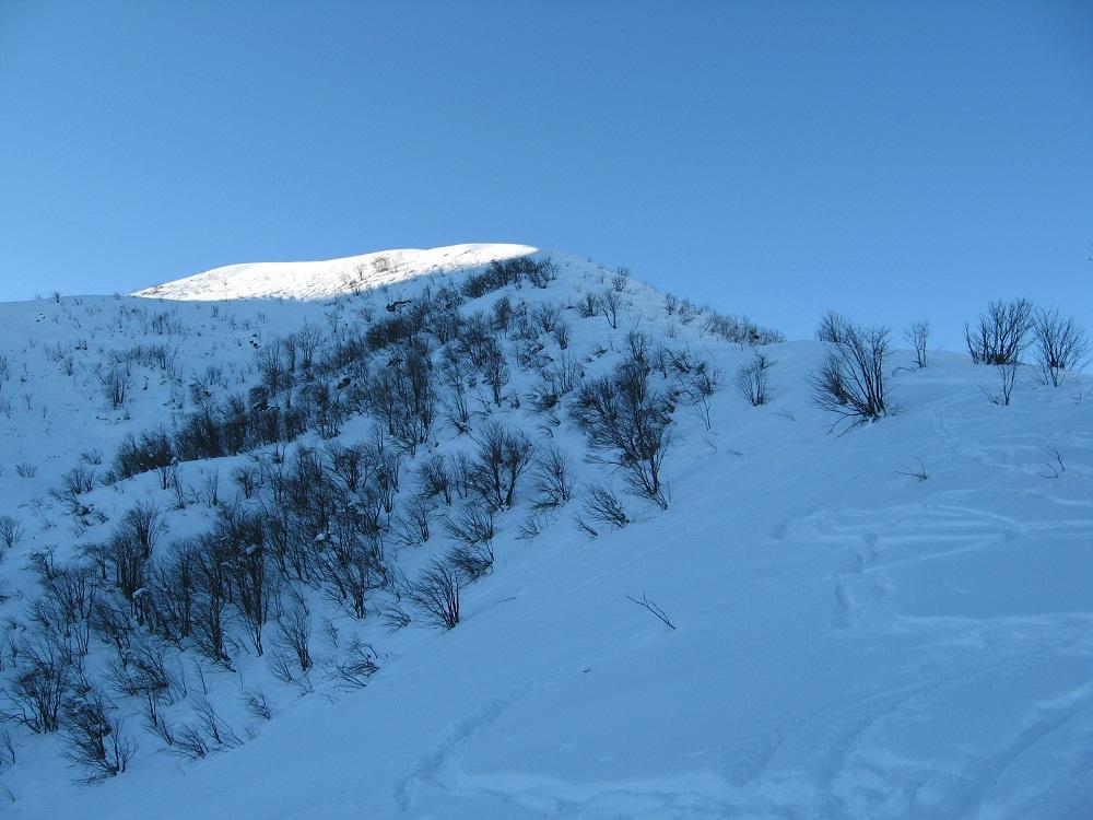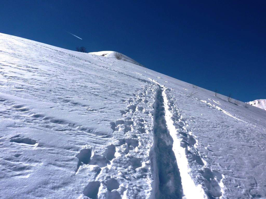 Ritornati alla sella, si può iniziare la salita della Costa Campaula, subito con un tratto in buona pendenza fino a confluire con la dorsale E/NE dove ha origine il crestone principale di salita.