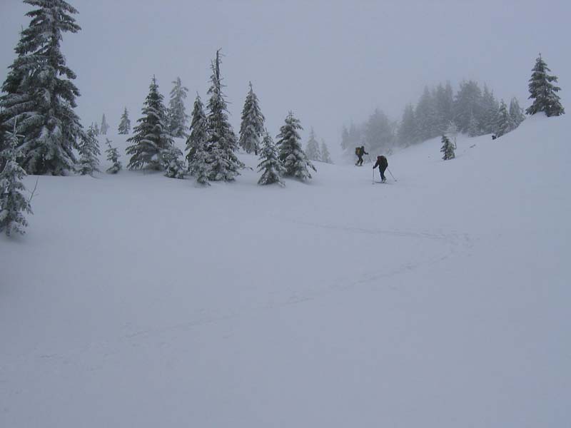 Le previsioni del tempo davano perturbato e abbiamo quindi scelto una partenza tardiva ed un itinerario con molto bosco. La partenza tardiva non ci ha premiato perchè mentre salivamo in auto c’era un pò di apertura con molte vette scoperte, ma man mano che salivamo la nebbia ha finito di coprire le cime. Peccato perchè mentre arrivavamo a Campolino, abbiamo incrociato gli amici camaioresi Francesco e Patrizio che già scendevano dopo aver fatto il Trittico del Sestaione e cioè salita al Tre Potenze (con 10 cm. di neve farinosa nuova sopra un fondo molto duro), poi a Diaccio al Bosco e infine Campolino. Comunque ambiente stupendo con i 10 cm. di neve nuova in alto che ammanta gli abeti con effetto galaverna sugli ultimi faggi cedui. In discesa, quando lo stradello ex blu gira a sinistra per scendere al ponte sul Sestaione, abbiamo preso sulla destra per boschi aperti, scendendo gradatamente con buona neve fino all’alveo del Sestaione (conviene però tenersi più alti). Siamo risaliti leggermente guadando su fragili ponti alcuni fossi ritrovando infine il sentiero che ci ha portato al ponte della Sega, m. 1180 da cui in breve sulla Prov/le un 2/300 metri sotto il bivio per il Sestaione. Le prossime volte merita partire di qui.