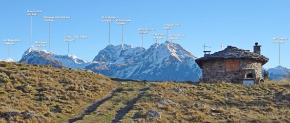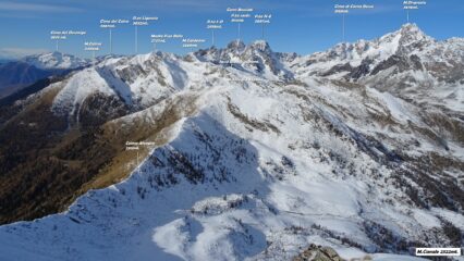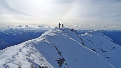 Da segnalare che la colonnina eroga ticket a Ligari per il permesso di transito alla strada carrale per Forcola non funziona. Giunti poi a Forcola iniziamo l’escursione salendo la strada carrale, abbandonandola pochi tornanti dopo prendendo una deviazione su sentiero che sbuca al l’Alpe Poverzone. Da qui seguiamo le segnalazioni per il M.Rolla, calpestando i primi cm. di neve,passando prima il tratto di bosco e poi la panoramica dorsale in campo aperto che porta all’omino di vetta dove ammiriamo un grandioso panorama sulla Valtellina. Dalla cima ci abbassiamo di 100mt. sulla facile cresta verso la B.tta Valdone ,dove per l’esposizione, troviamo più neve. Dalla bocchetta primo strappo ripido seguendo la labile traccia tutta pulita con assenza di neve, poi a circa metà cresta la si incomincia a trovare, nei tratti un po’ piani con accumuli ventati. Ultimo tratto di cresta abbastanza pulito fino all’anticima, da li al M.Canale accumuli di neve ventata con sprofondamenti, in alcuni tratti, fino al ginocchio. Picca e ramponi rimasti nello zaino utili ghette. Per la discesa si pensava di proseguire scendendo la cresta NO verso la Colma di Arcoglio ed il monte omonimo, ma le condizioni della neve non portante senza fondo han fatto naufragare i nostri piani, troppo alto il rischi di imbucarsi. Scesi a ritroso fino la B.tta Valdone dove prendiamo la labile traccia che scende verso L’Alpe Marscenzo. Da qui comodo rientro sulla strada che riporta a Poverzone e poi a Forcola.