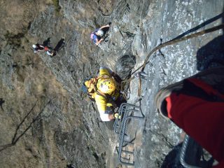 ravanare,abbiamo ravanato, su questo non c’è dubbio. Ma quando la compagnia merita ci può stare anche questo. E’ una ferrata da fare, non difficile, le valutazioni date sono corrette, PD la prima e l’ultima parte, AD/D la parte centrale, nessun passaggio di forza o strapiombante,molto panoramica sulle cime circostanti.Condivido sul fatto di prestare molta attenzione alla discesa (al momento),utili un paio di bastoncini per sicurezza.Sicuramente quando sarà omologata e quindi ridefinito il sentiero di accesso e quello di rientro le cose non potranno che migliorare.