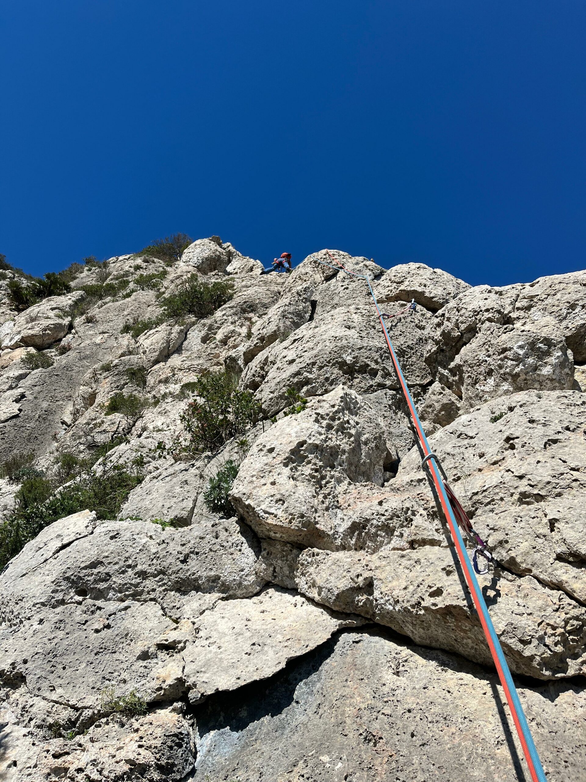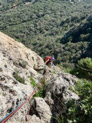 Arrivati sopra la grotta affrontare con decisione il ribaltamento (non facile), eventualmente usando la chiodatura a destra del fix arrugginito. Dopodichè continuare su placca, con bella roccia ma bella verticale. Eventuale clessidra per sopperire alla chiodatura. Conviene fare sosta ad una catena in buono stato, sopra a quelle marce che troverete. 6a, poco azzerabile nel ribaltamento. - L2 Qua la chiodatura migliora. La via, dopo una prima parte sul facile, piega a destra, cercando la difficoltà su una bellissima placca. Continuare verticalmente fino ad arrivare ad una sosta a spit vicino agli alberelli, dove poi finisce la via e si prosegue per lo spigolo di canne d’organo. 6a, azzerabile. Eventualmente se si rimane più a sinistra le difficoltà calano.