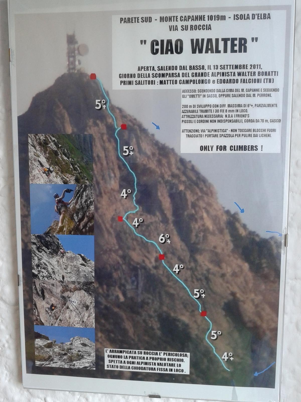 Via aperta il giorno della morte di Bonatti, da qui il nome, da Matteo Campolongo e Edoardo Falcioni. Non ho percorso la via ma ho voluto segnalarla perché non c'è notizia sul web di questo lavoro svolto da due alpinisti trentini che hanno posizionato 30 fix lungo il percorso, aprendo la prima via alpinistica al Monte Capanne. Sicuramente una via da salire in primavera o autunno, d'estate fa decisamente troppo caldo.