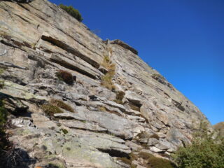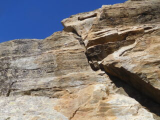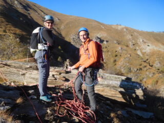 Prima ripetizione della via! Il giudizio di noi cinque è assolutamente positivo. La traccia di avvicinamento dal rifugio all’attacco è ben segnalata con bolli arancione fluo su piante e roccia, la via è attrezzata egregiamente come da descrizione , golfari alle soste da unire con cordoni, fix ben posizionati, bolli di vernice nei trasferimenti, corde fisse all’attacco, alla partenza di L 4 e all’inizio della discesa. Si potrebbe aggiungere una fissa quando si scende lungo un caminetto sul versante opposto che noi abbiamo trovato umido. Anche la discesa è ben segnalata dai bolli arancio su rocce e piante come da descrizione. Dalla cima al park abbiamo impiegato un’ ora abbondante. La roccia è di buona qualità, in qualche tratto colava per la recente nevicata ma non dove si arrampica. La calzatura corretta è lo scarpone leggero un po’ rigido, noi avevamo pedule da avvicinamento e in qualche punto avrei preferito qualcosa di più consistente. Utile una corda da 30 metri o una da 60 doppiata. L2, il passo del gatto è divertente ma scomodo da rinviare con lo zaino, anche la successiva breve placchetta liscia ( 4b ) è da studiare un attimo, io per non perdere tempo ho aggirato a sx per rododendri.