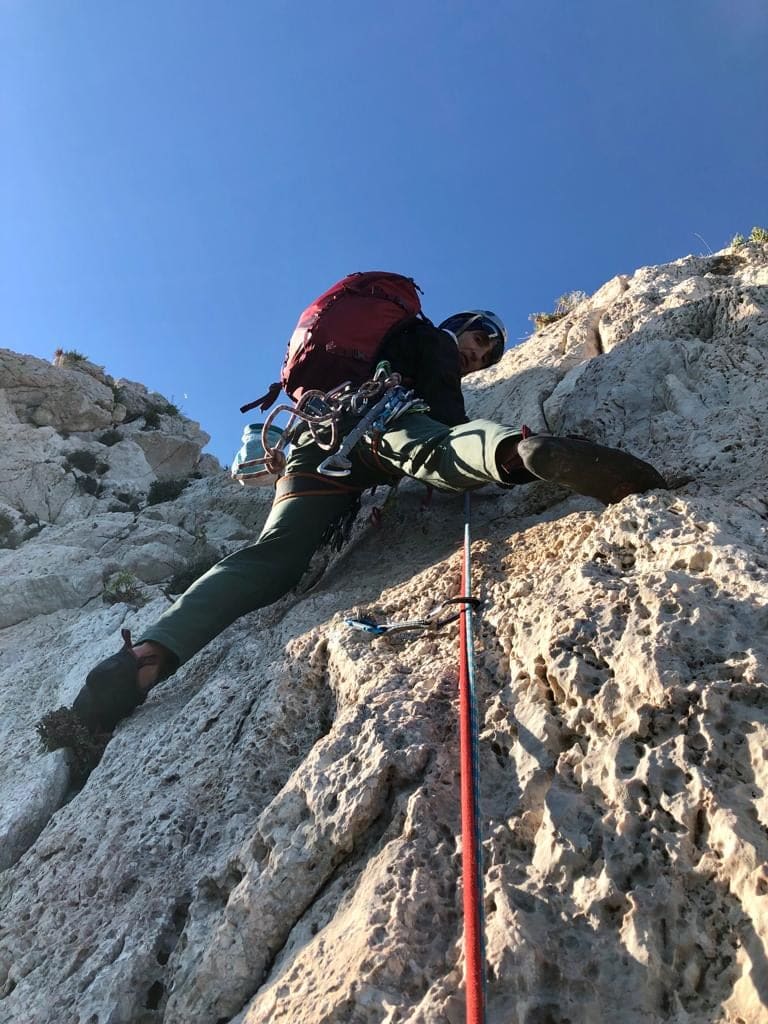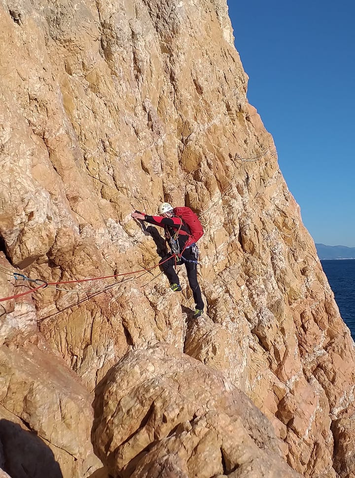 stupenda cavalcata in ambiente unico, da tanto che avevo in mente questo traverso, sicuramente fuori dalle nostre abitudini montane. Sempre a picco sul mare, difficolta’ non estreme, ma sempre bei passaggi, alcuni delicati, la roccia anche se non sembra è sempre ottima, molte clessidre, alcuni chiodi e fix, portarsi a presso soprattutto cordini e fettucce e giusto un paio di frends. gli ultimi 2 tiri super!
