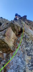 La via non è male, roccia buona e ben chiodata, non mi è sembrata pericolosa come affermato da qualcuno, c’è di peggio. Confermo invece i tratti terrosi presenti specialmente sul 7° tiro, poco prima della sosta che però, con un po’ di attenzione, si passano bene posando i piedi sulle rocce intorno. L’ambiente è di montagna, i vari trasferimenti facili ma con le dovute cautele. Il 1° tiro da la sveglia su bella roccia, non banale. Sul 3° tiro fatto la variante a sx, chiodata e sostato al primo fix alla base della bella placca per evitare attriti. Gli ulteriori tiri, un po lichenati ma essendo ben secchi si scala bene, bella la placca del 4° tiro, esposta ma molto lavorata. Ultimo tiro, il più impegnativo ed anche il più bello, oltre ai fix, possibile piazzare alcuni friends piccoli e medi. La mezz’ora di avvicinamento ci è sembrata molto ottimistica, noi impiegati 50 minuti, anche perché la salita dei 100mt dalla scritta sul sentiero a quella dell’attacco, è un po disagevole per i rododendri nonostante le tacche bianche. Con Igi.