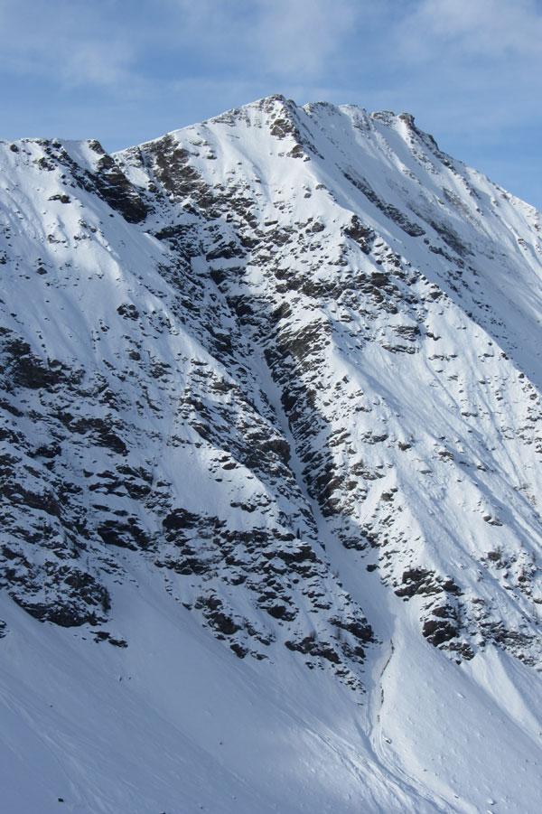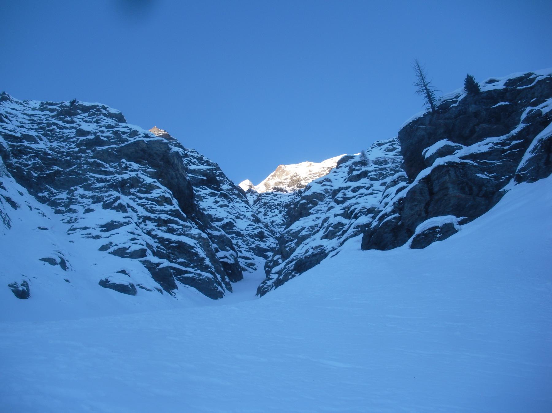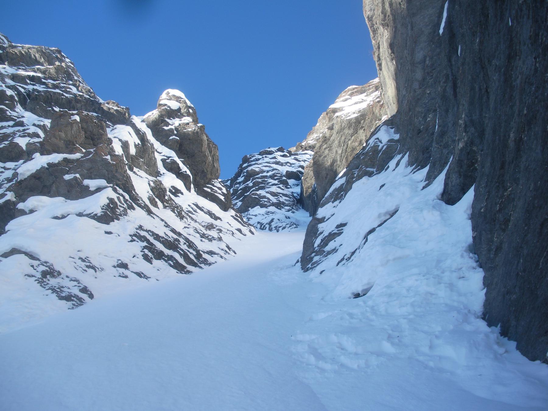 Risalire il canale, piuttosto incassato e che piega verso sx, trascurando una deviazione sulla sx a circa 2500 m (450 m, 40-45 gradi).
