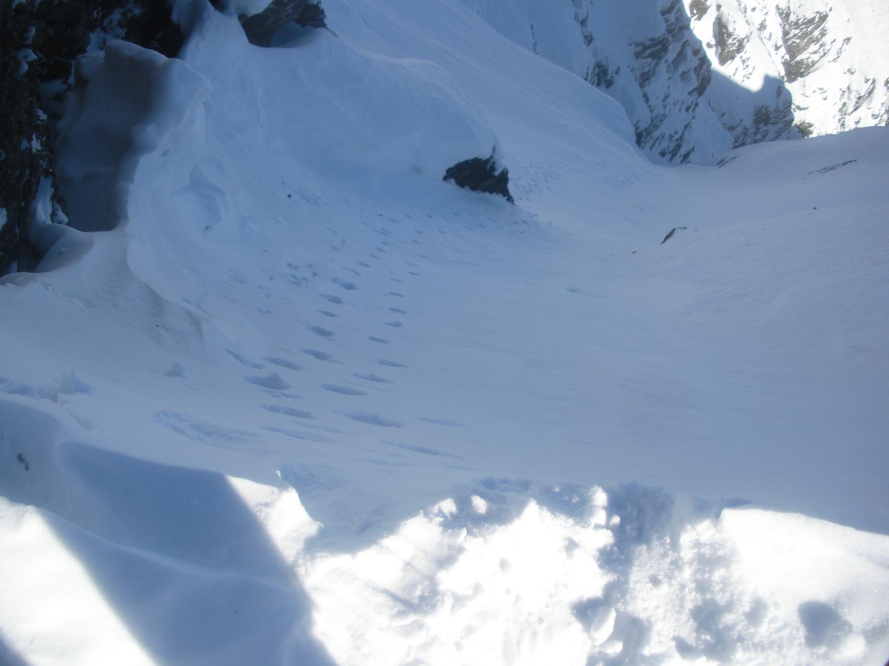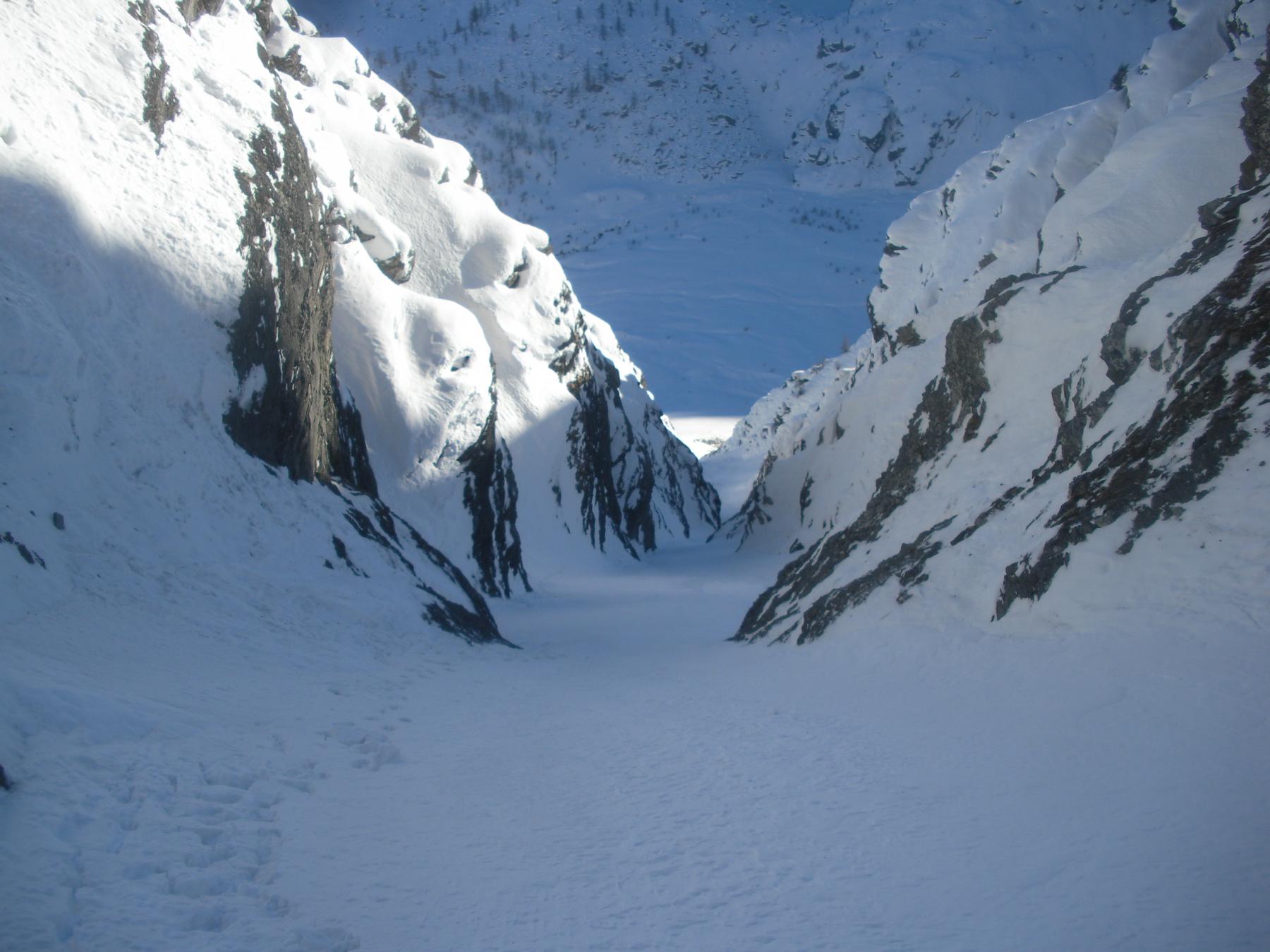 In alto il canale diventa più stretto e ripido (50 gradi nei 20-30 metri finali) e può presentare una cornice più o meno pronunciata.