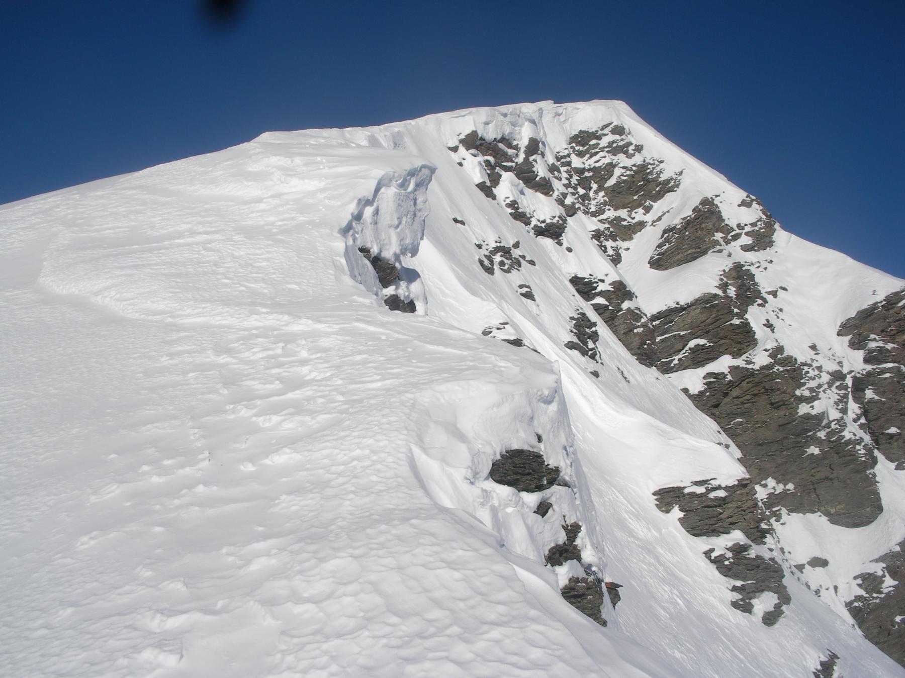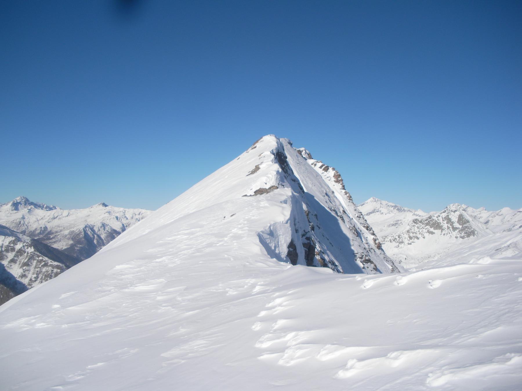 Dall’uscita, posta 200 m a NO del punto di valico vero e proprio, si segue la facile cresta SE, sul lato francese, dapprima più ripida, poi quasi pianeggiante fino all’ometto di vetta costruito sul bordo del versante NO.