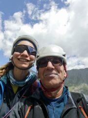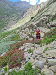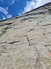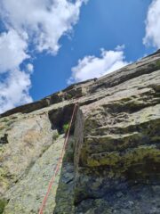 Abbiamo deciso di goderci un po’ di fresco pernottando al rifugio Vallanta il giorno prima di fare questa gita. Dal rifugio è necessario chiedere informazioni per le indicazioni per l’attacco, in quanto non è segnato da ometti o bollini se si parte di lì, e richiede 50 minuti buoni per raggiungere la via. Il percorso prevede l’attraversamento di diversi ruscelletti e di campi di rododentri magnifici (un po’ meno da oltrepassare…). Ci siamo evidentemente tenuti più in alto del dovuto e abbiamo raggiunto una cengia erbosa, alla seconda sosta dello zoccolo. Fortunatamente gli spit blu michelin hanno indicato chiaramente il percorso da seguire. Gli unici ad ad arrampicare oggi. Una volta svolto l’ultimo tiro dello zoccolo, si raggiunge l’attacco della via vera e propria (8 tiri), con alla base targhetta e scritta. I primi 2/3 tiri sono molto consumati e la roccia è abbastanza scivolosa. Tutta la via è di tecnica e gambe, si tira ben poco per salire. Lo strapiombino di L6 si supera molto facilmente. In generale abbiamo trovato la via spittata poco e non dove serviva. La maggior parte dei tiri non sono proteggibili e ci si ritrova con diversi metri senza protezioni… Le vie trad sono belle se proteggibili, altrimenti inseriscono inutili pericoli in uno sport già delicato. Discesa con doppie, la maggior parte dei tiri sono tra i 30 e 35 metri, quindi non siamo riusciti ad unirne nessuno. Fortunatamente non si sono impigliate le corde, ma sono presenti diverse fessure pericolose. Soste un po’ datate ma sicure, tutte presentano due fix uniti da cordino e maillon.